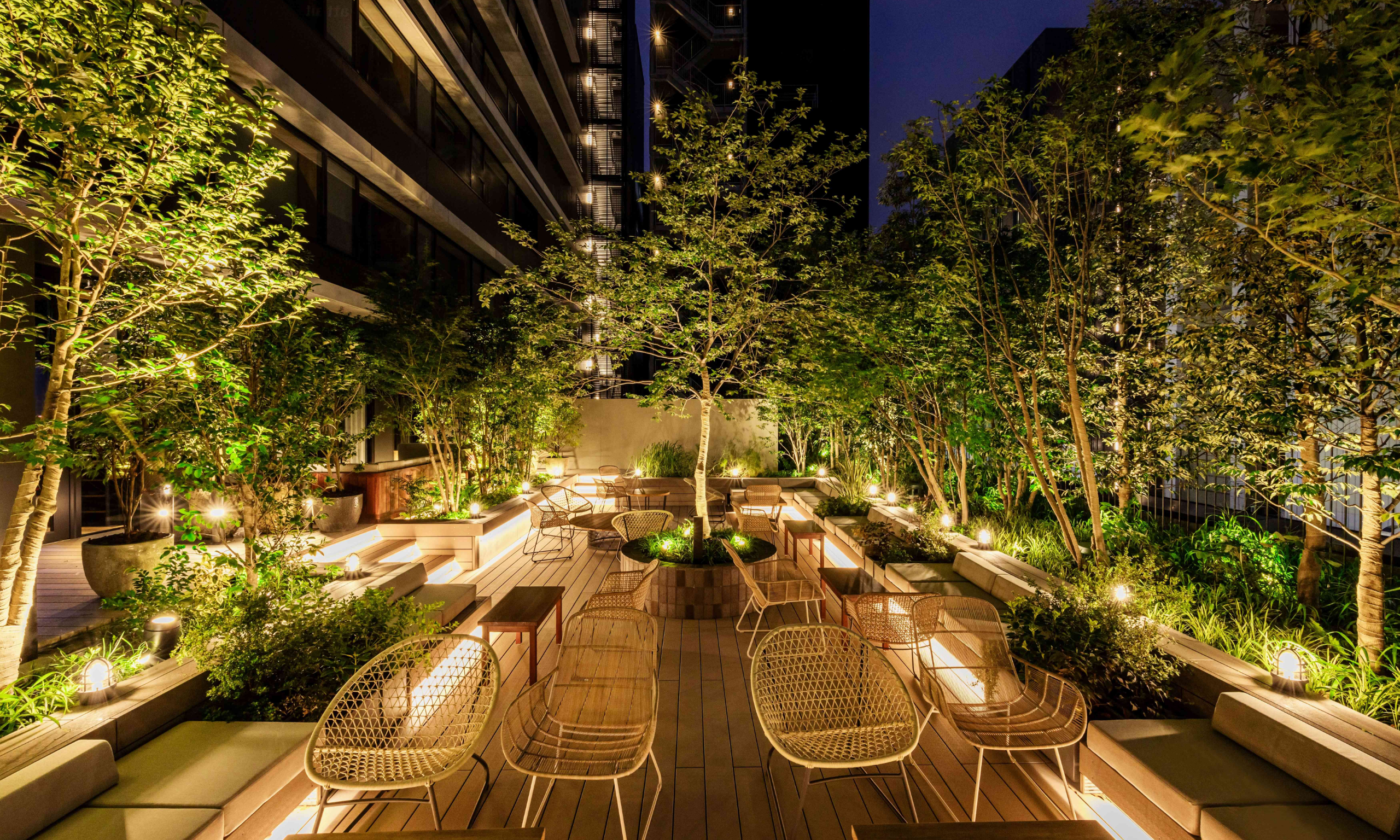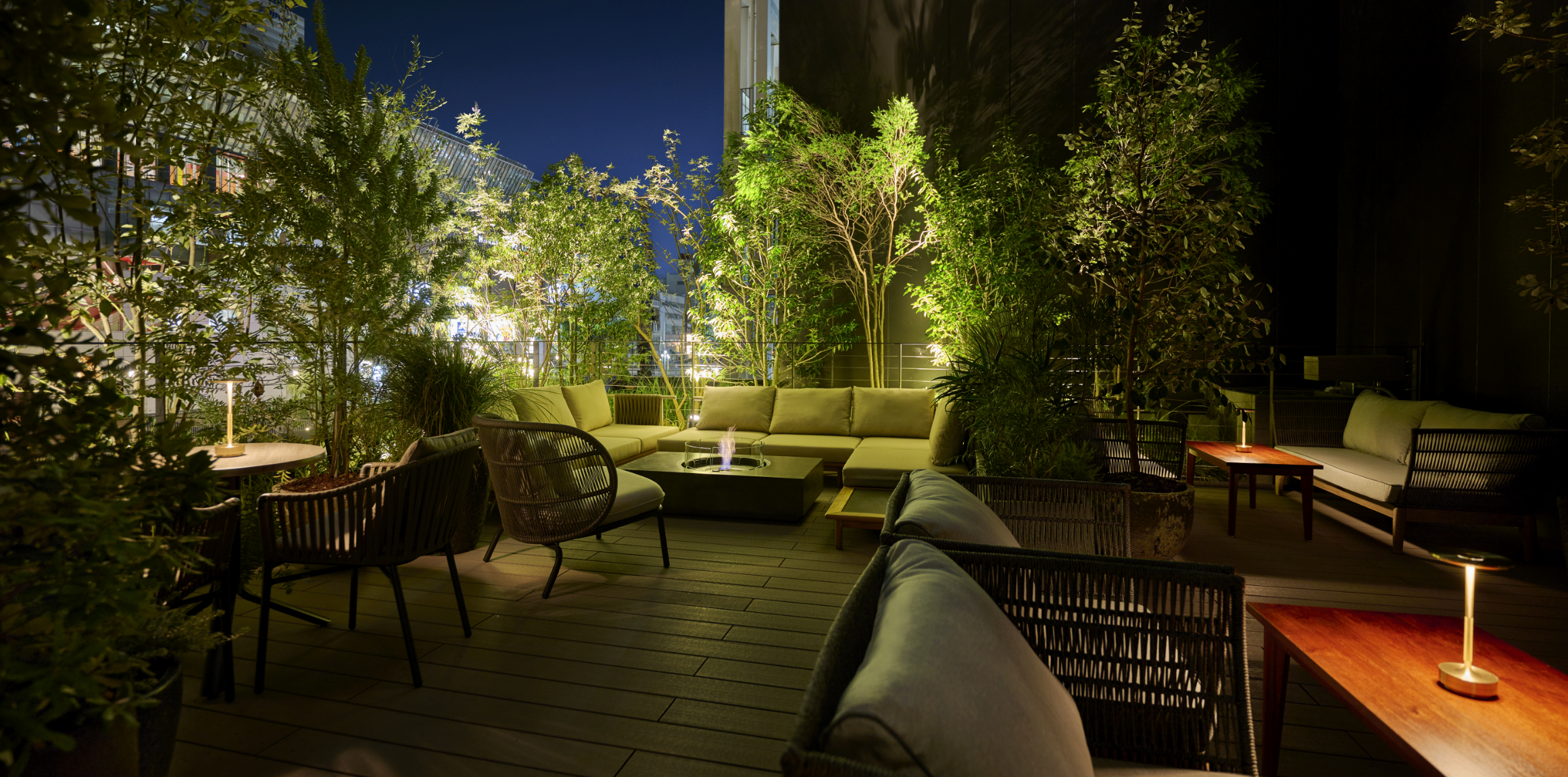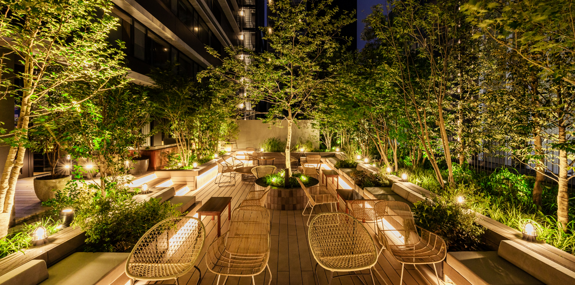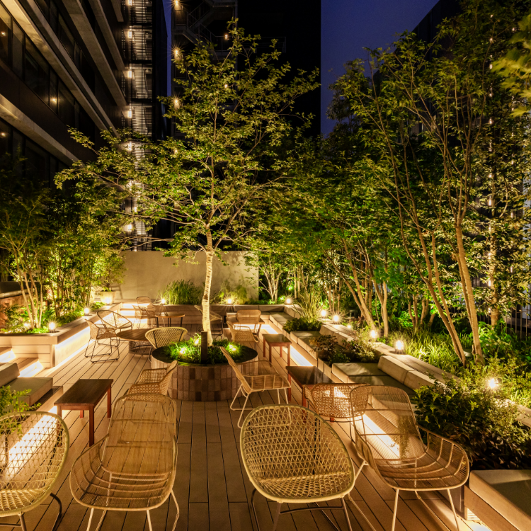 四季折々に変化する木々を配した癒しの空間である、ルーフトップガーデン。福岡中洲という都会にいながら、九州に広く分布する照葉樹林の森“九州の森”の中で涼むような心地よい時間をお過ごしください。