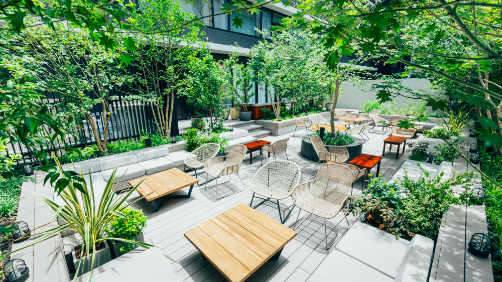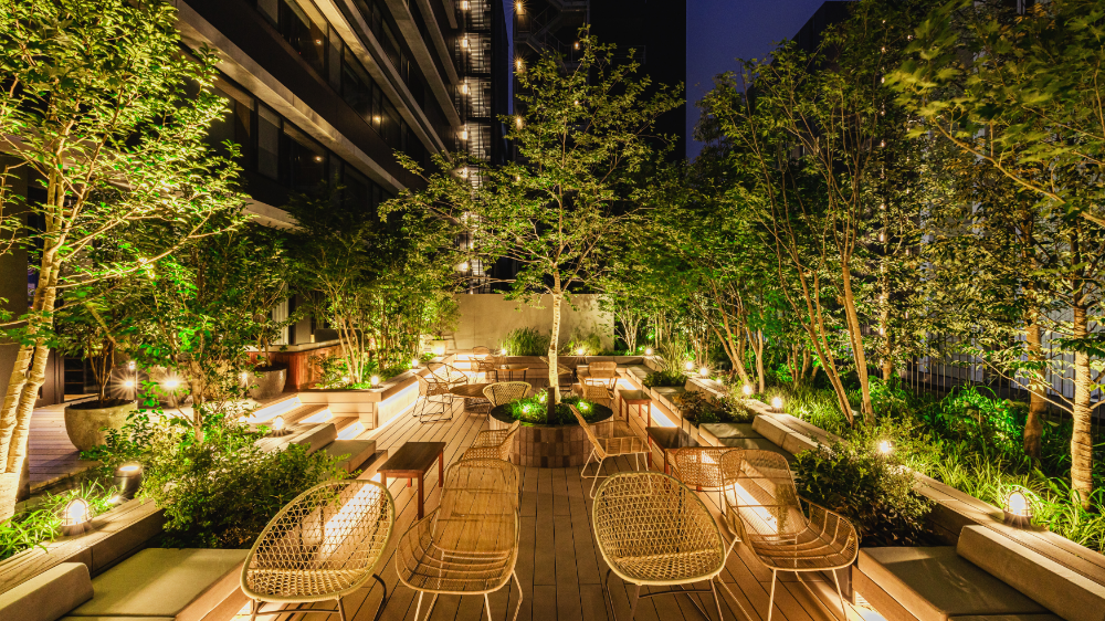 木々に囲まれたルーフトップガーデンは、都会にいながら、“九州の森”に包まれるような心地よい時間を過ごせる。