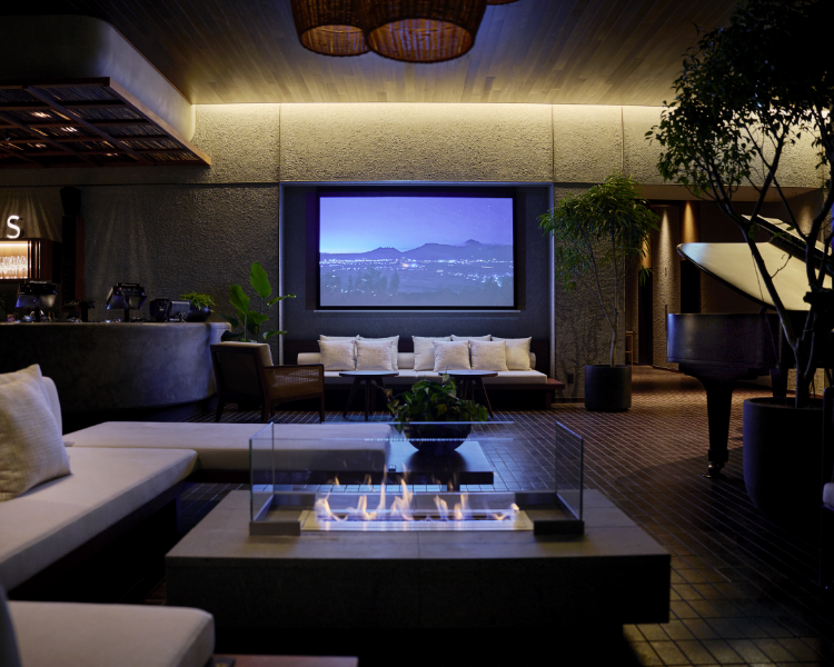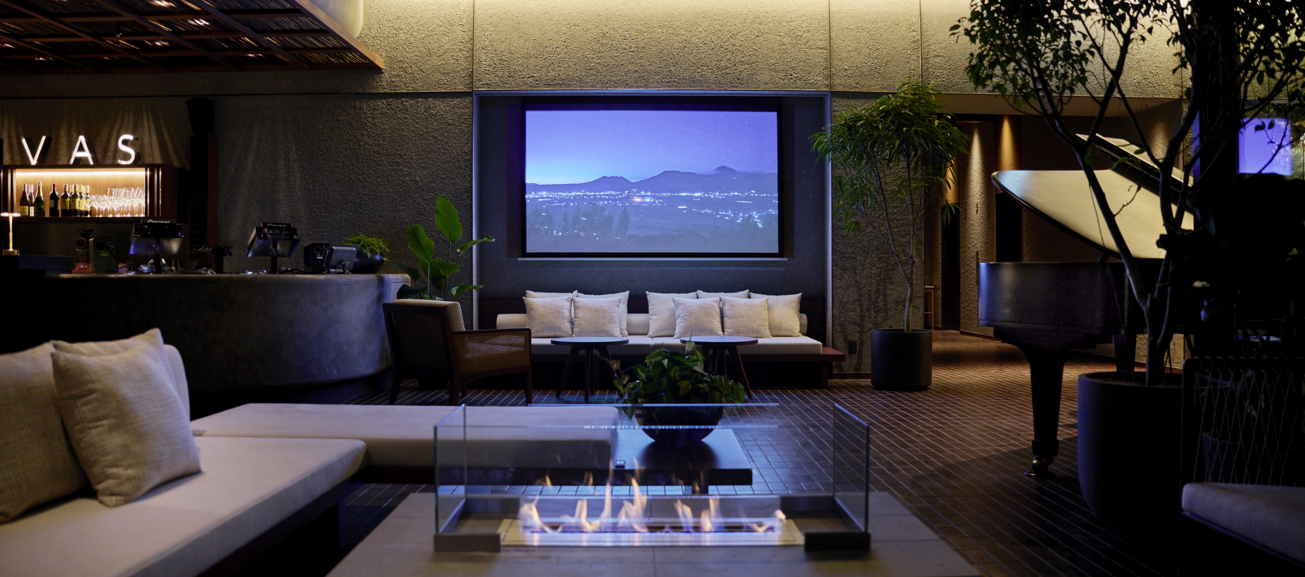 博多川を望むテラス席を併設したキャンバスラウンジ。スタインウェイのピアノやDJブースを用意し、