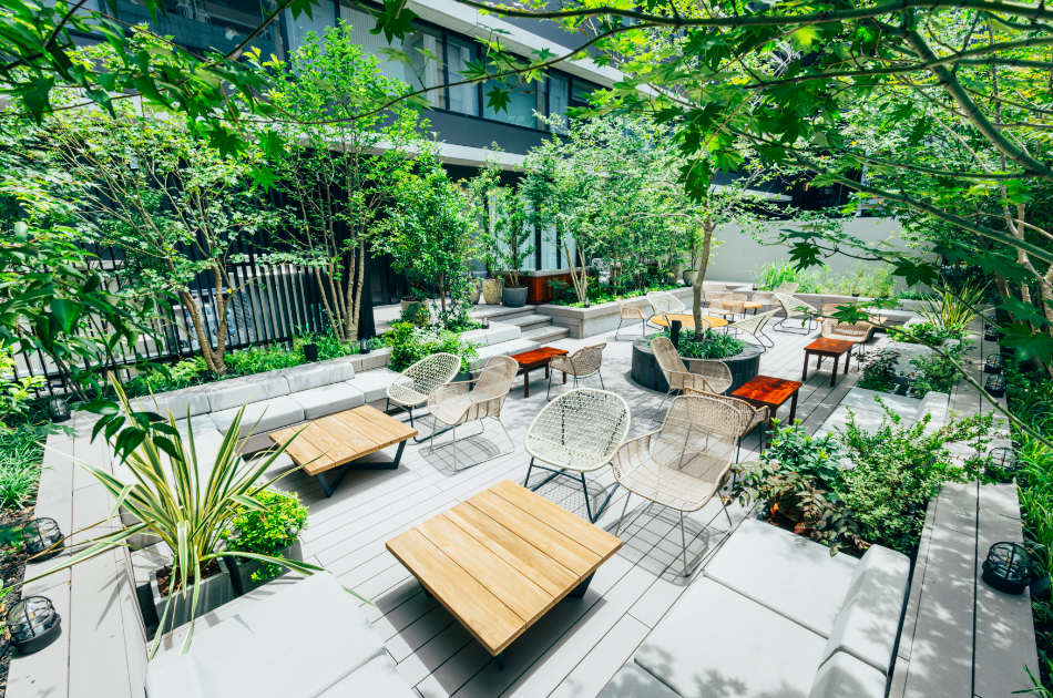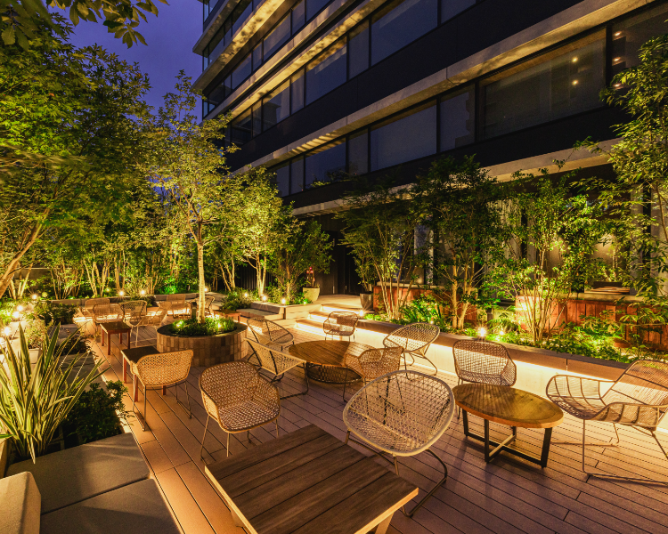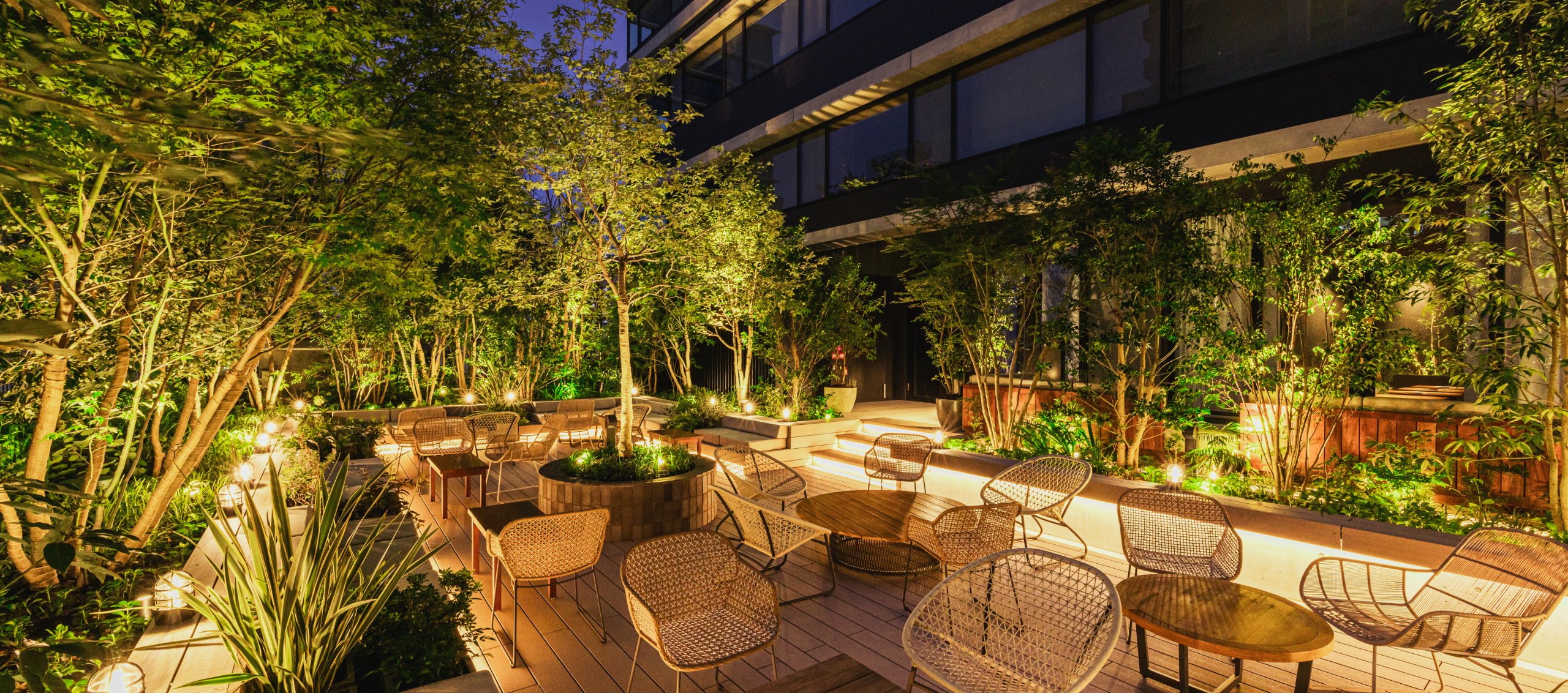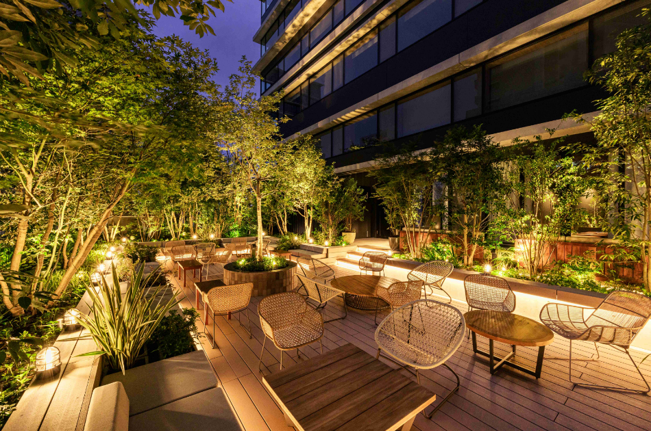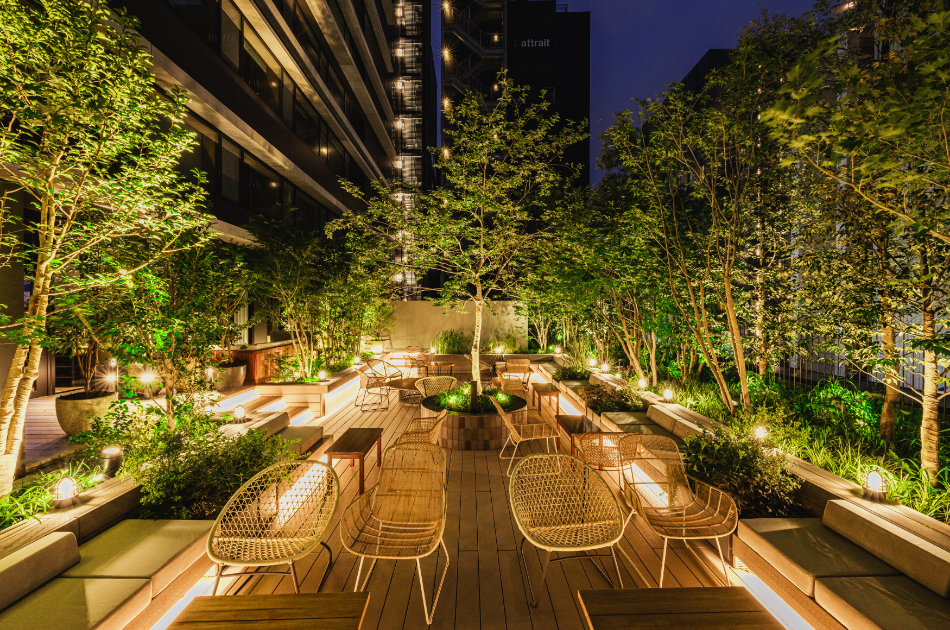 木々に囲まれたルーフトップガーデンは、都会にいながら、“九州の森”に包まれるような心地よい時間を過ごせる。