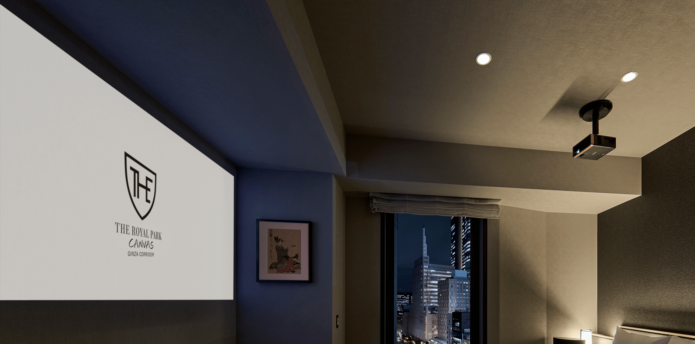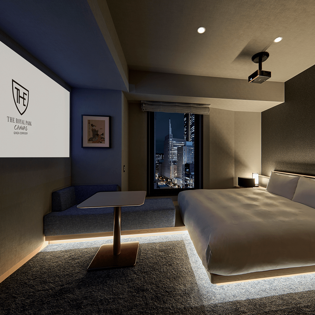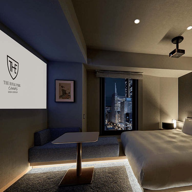 銀座の中でも活気あふれるコリドー街に佇む客室をプライベートなEntertainment Roomと考え、全客室にプロジェクター&高音質スピーカーを完備。好きな「音」 と 「映像」 に酔いしれながら、あなただけの充実した時間をお過ごしください。