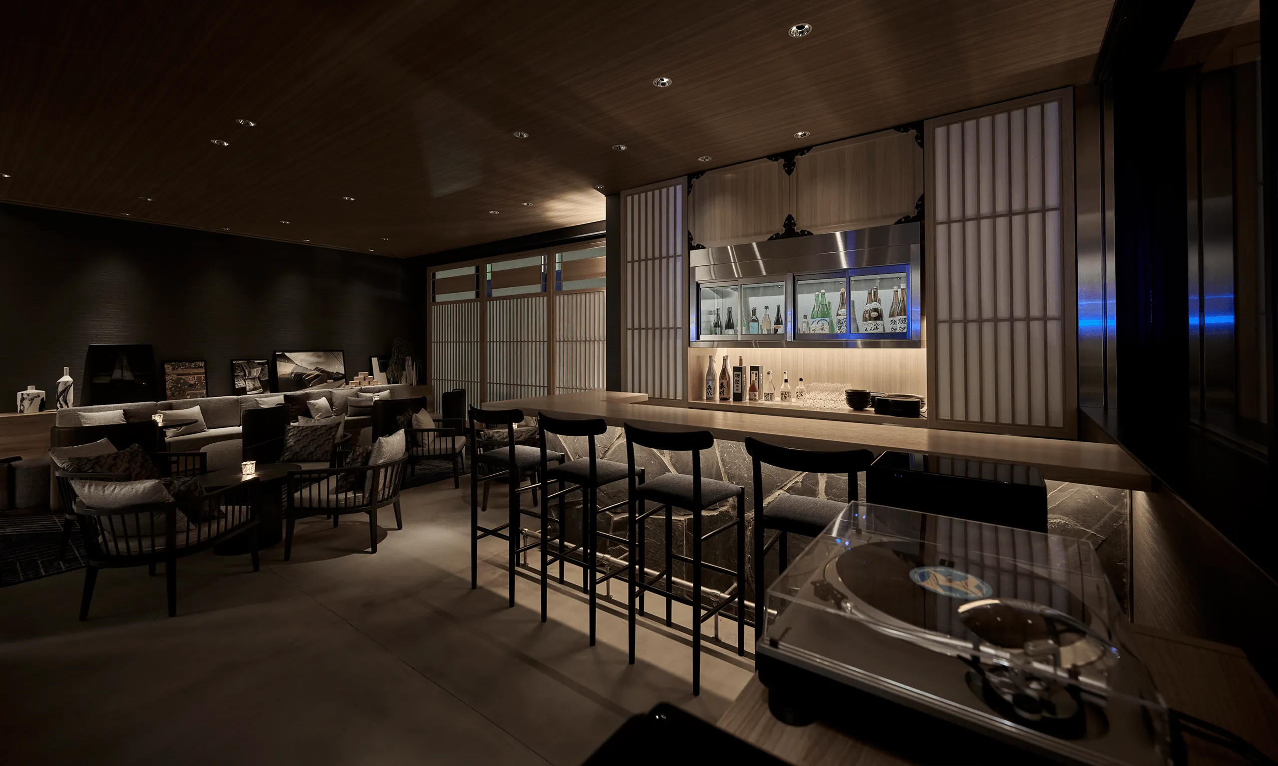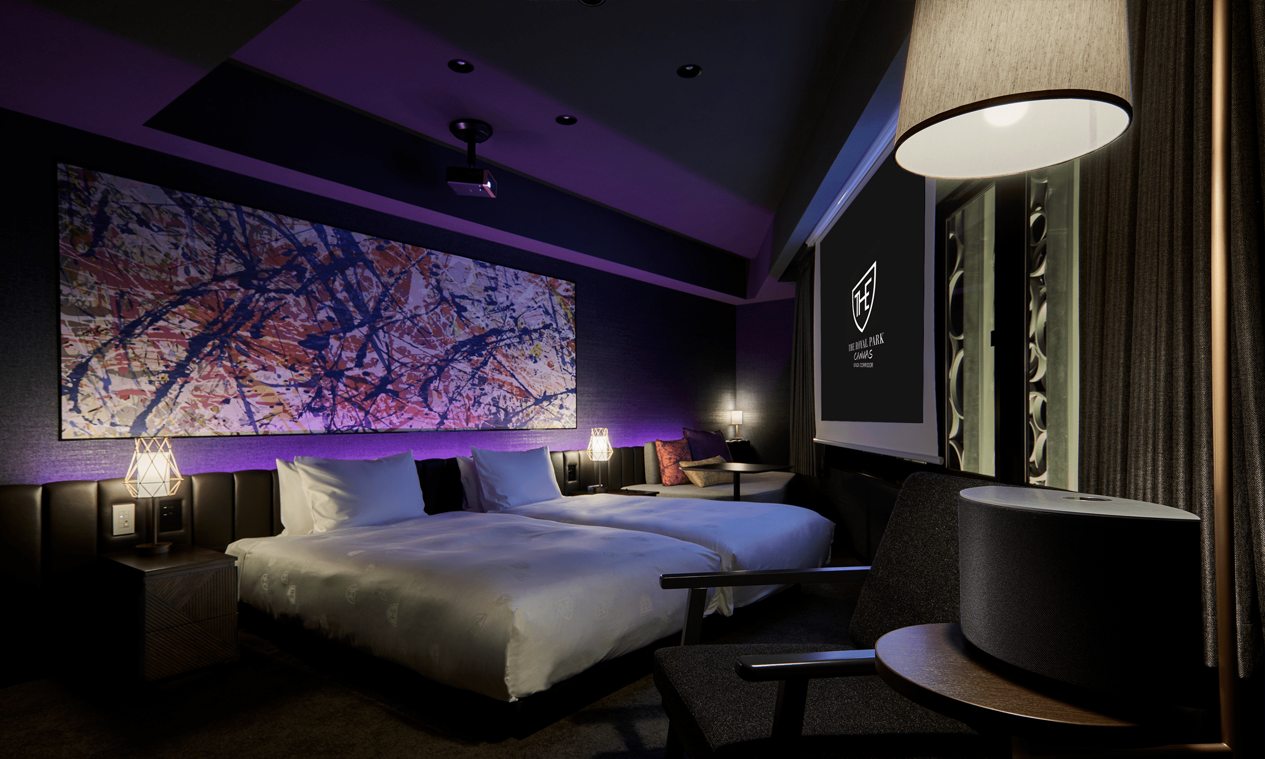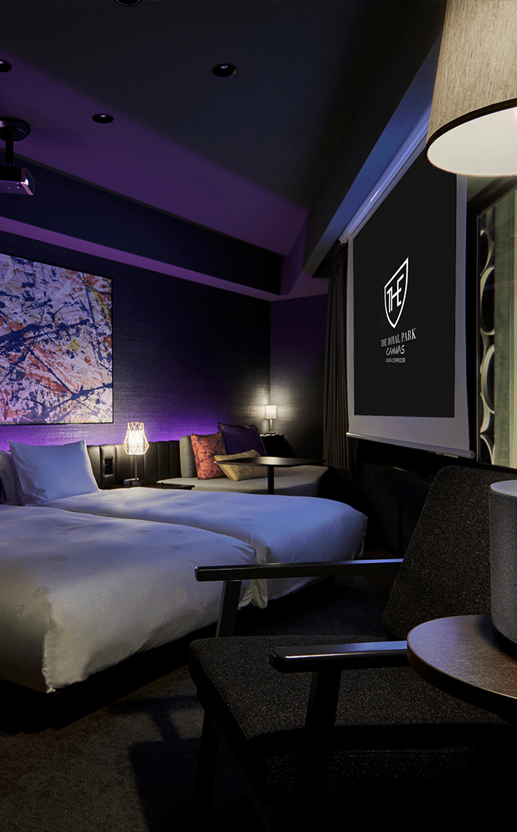 客室は、3つのBarの世界感を表現。全客室にプロジェクター&高音質スピーカー完備し、ラウンジのDJライブが迫力のサラウンドそのまま、客室でもバスルームでもリアルタイムで楽しめます。