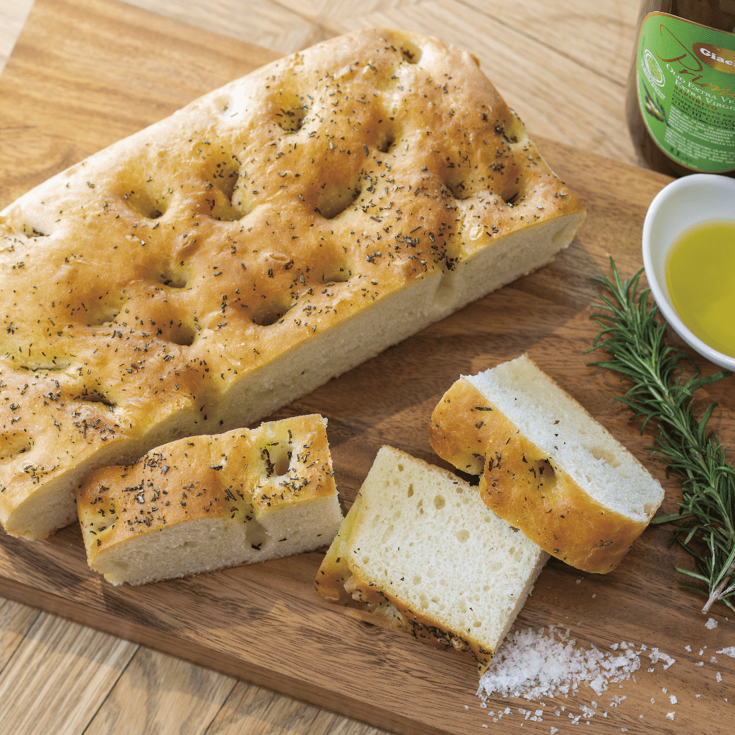 イタリア料理にはかかせない平焼きのパン・フォカッチャ。大きな生地にたっぷりのオリーブと岩塩を載せて焼き上げました。オリーブオイルと一緒にお召しあがりください。