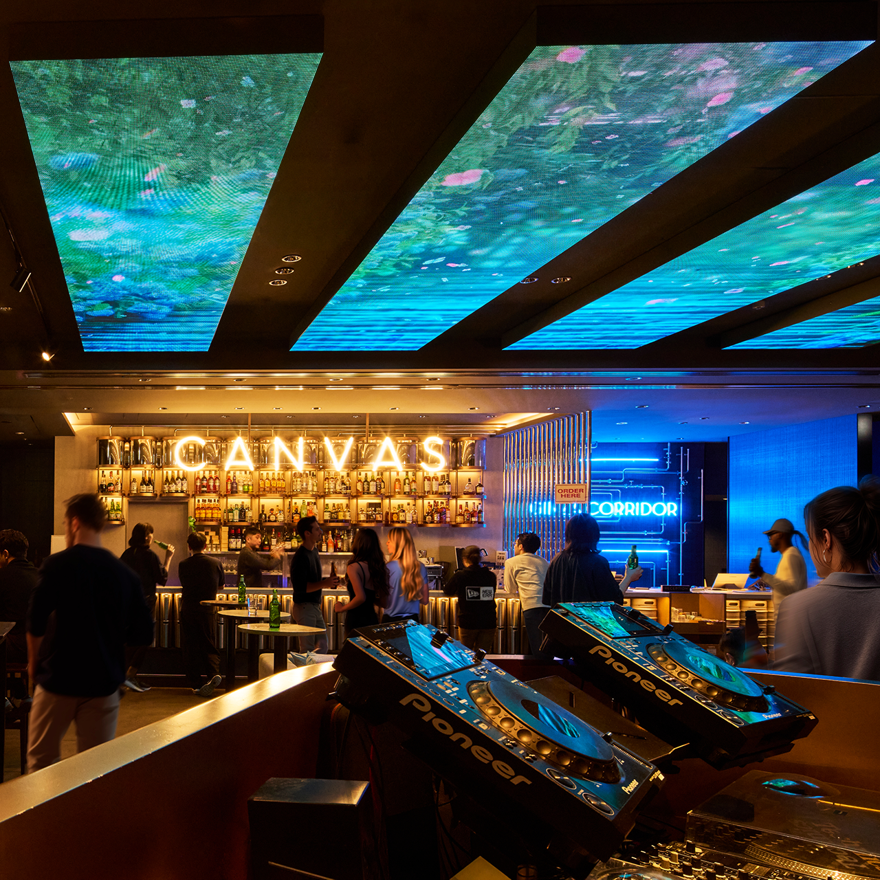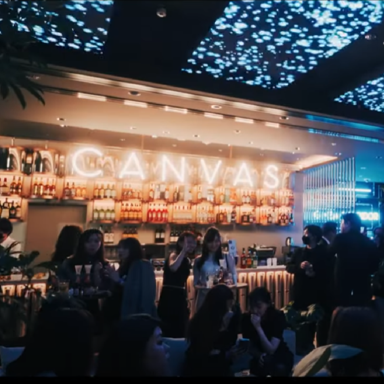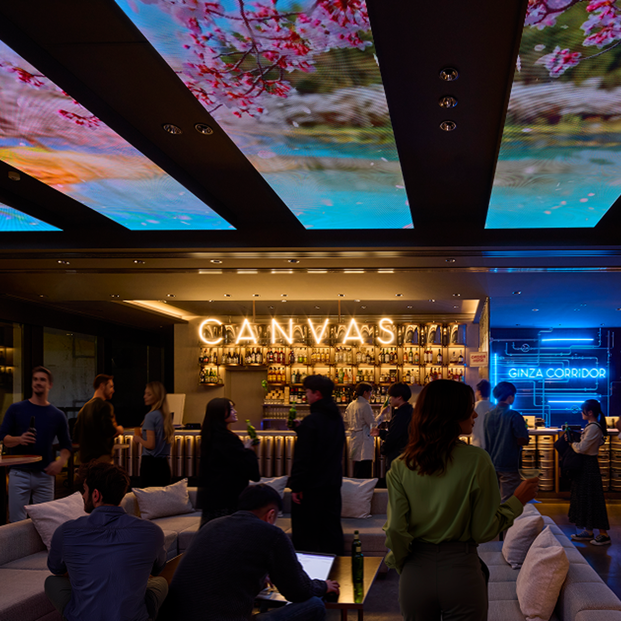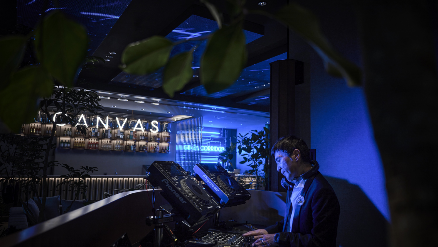 人が集い、セレンディピティな出会いが生まれるキャンバスラウンジ。深夜まで繰り広げられるDJ ライブが、ラウンジ全体を音と光と映像のミックスで盛りあげます。
