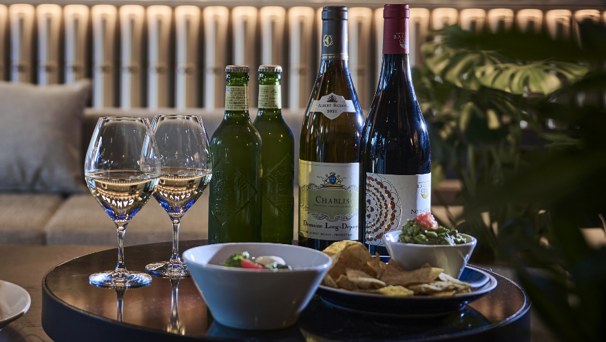 ビール、ワイン、カクテル、シャンパンのほか、ジャパニーズウィスキーなど、さまざまなお飲み物や、軽食、ピザ、サラダなど充実したフードメニューを提供しています。