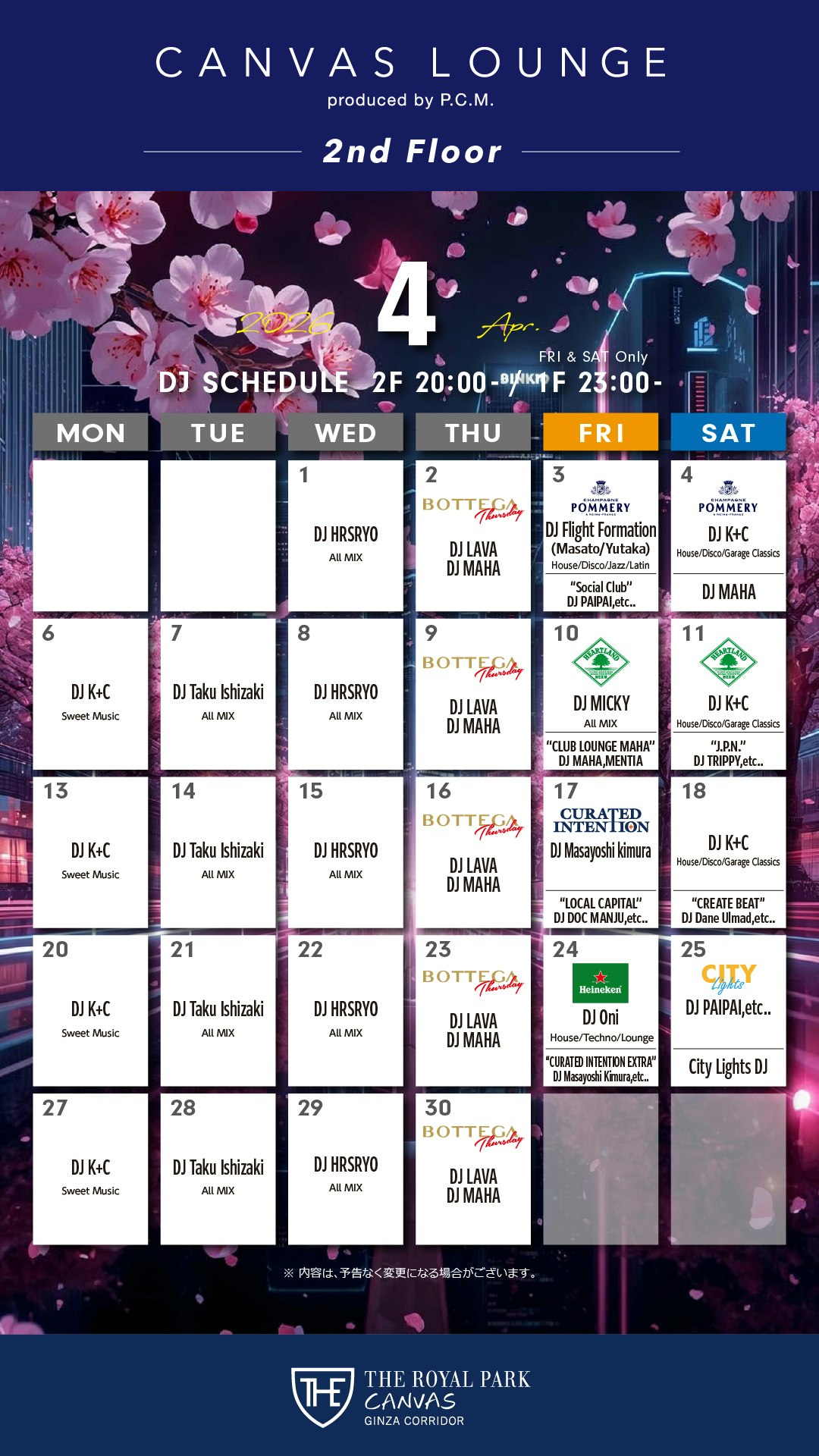 Canvas Lounge on The 2nd Floor DJイベント コアタイム 20:00~23:00※イベント内容は予告なく変更になる場合がございます。
