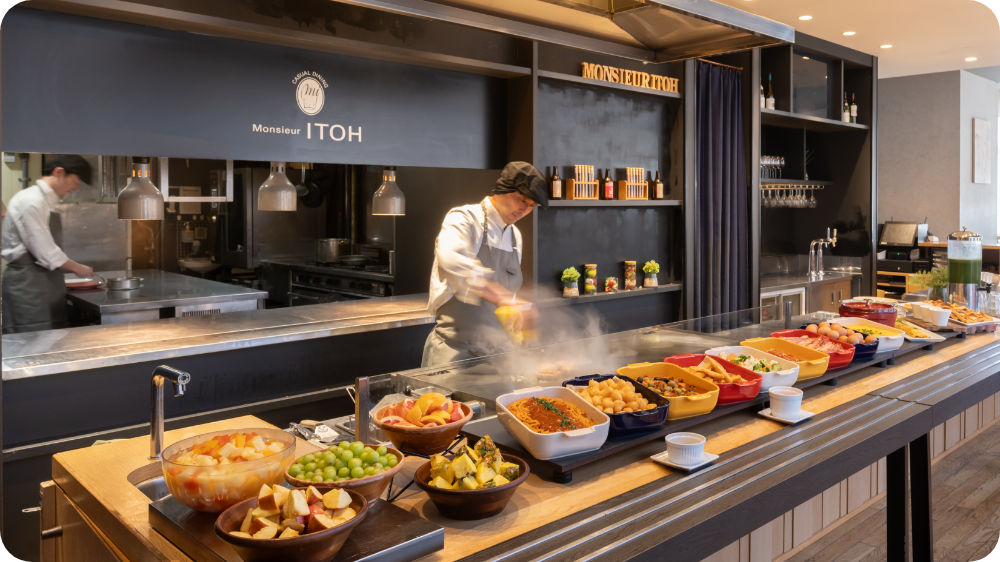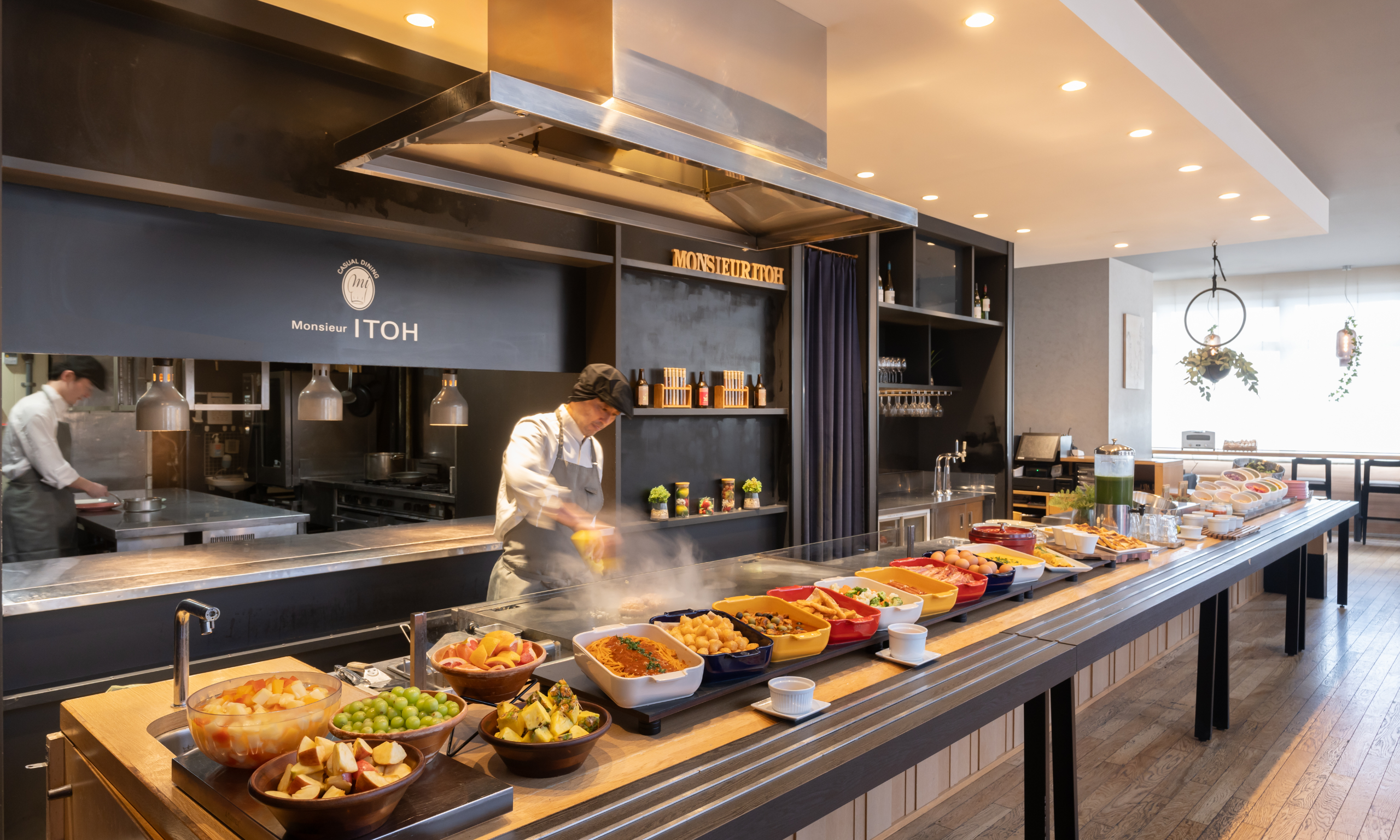 朝食では、ライブ感も楽しい“鉄板”名古屋めしを洋風アレンジで楽しめるフルブッフェをご提供。