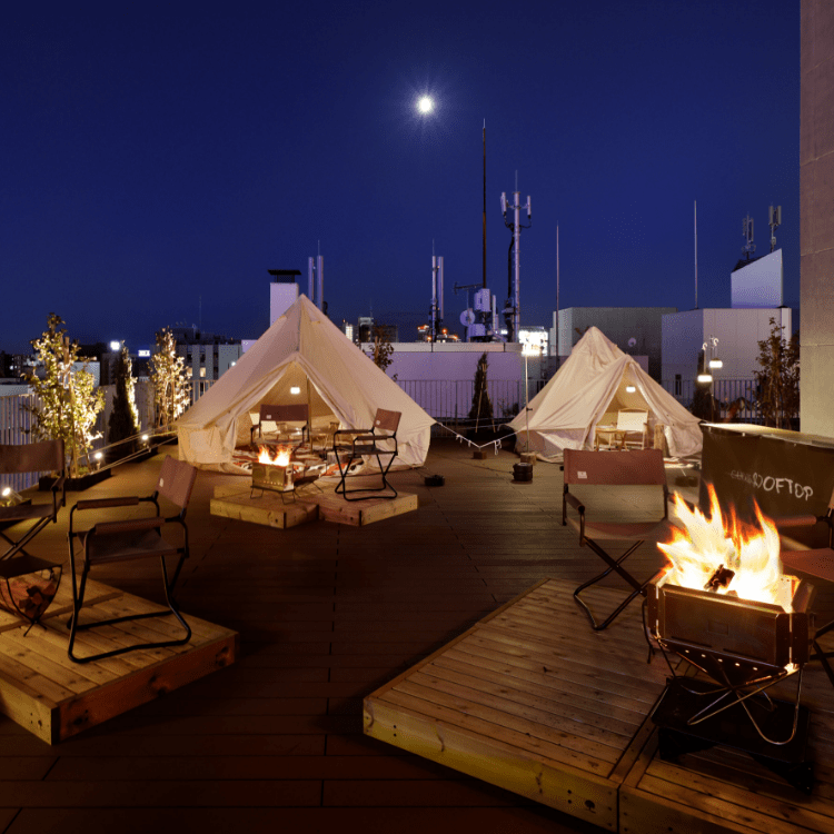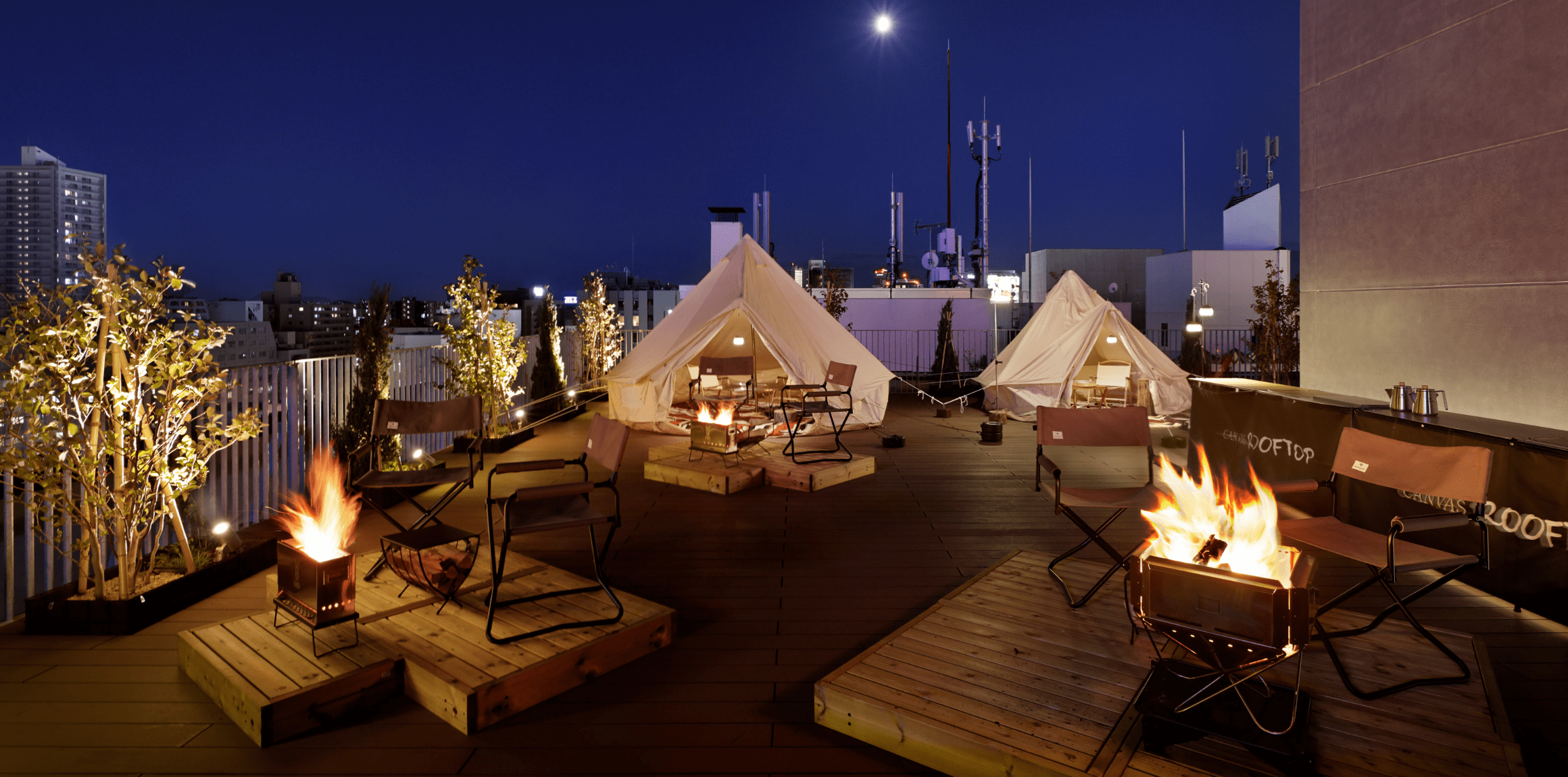 ウッドデッキの床で仕上げられた屋上は、焚き火や屋外シアター、⾳楽イベントなどあなたらしく過ごすCANVAS空間。