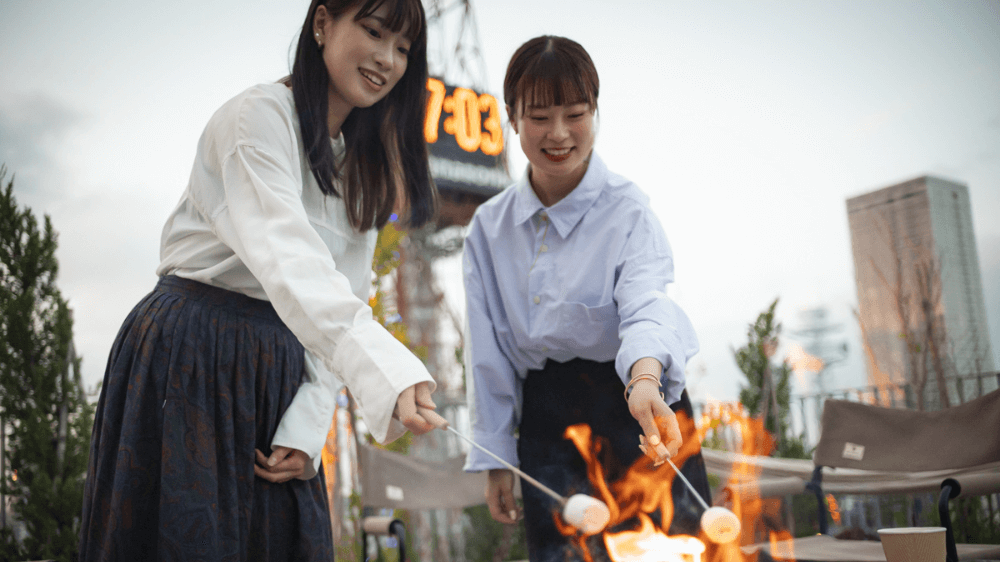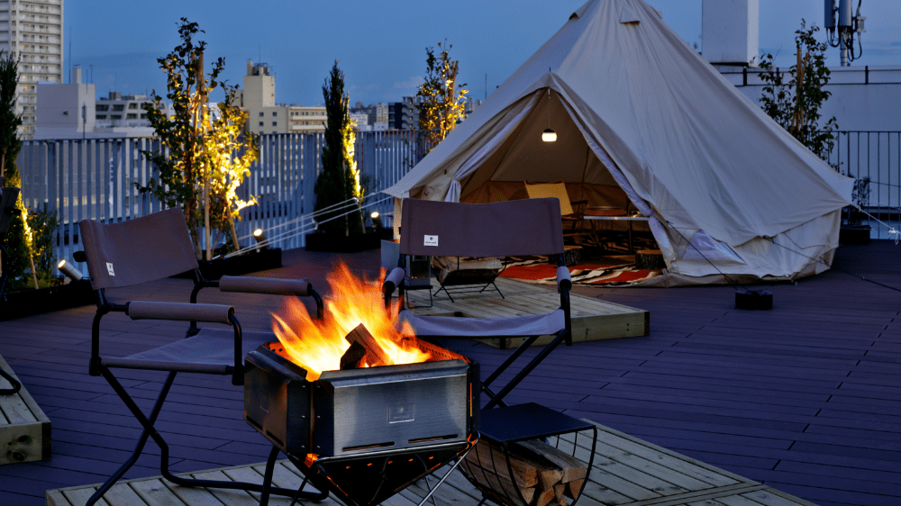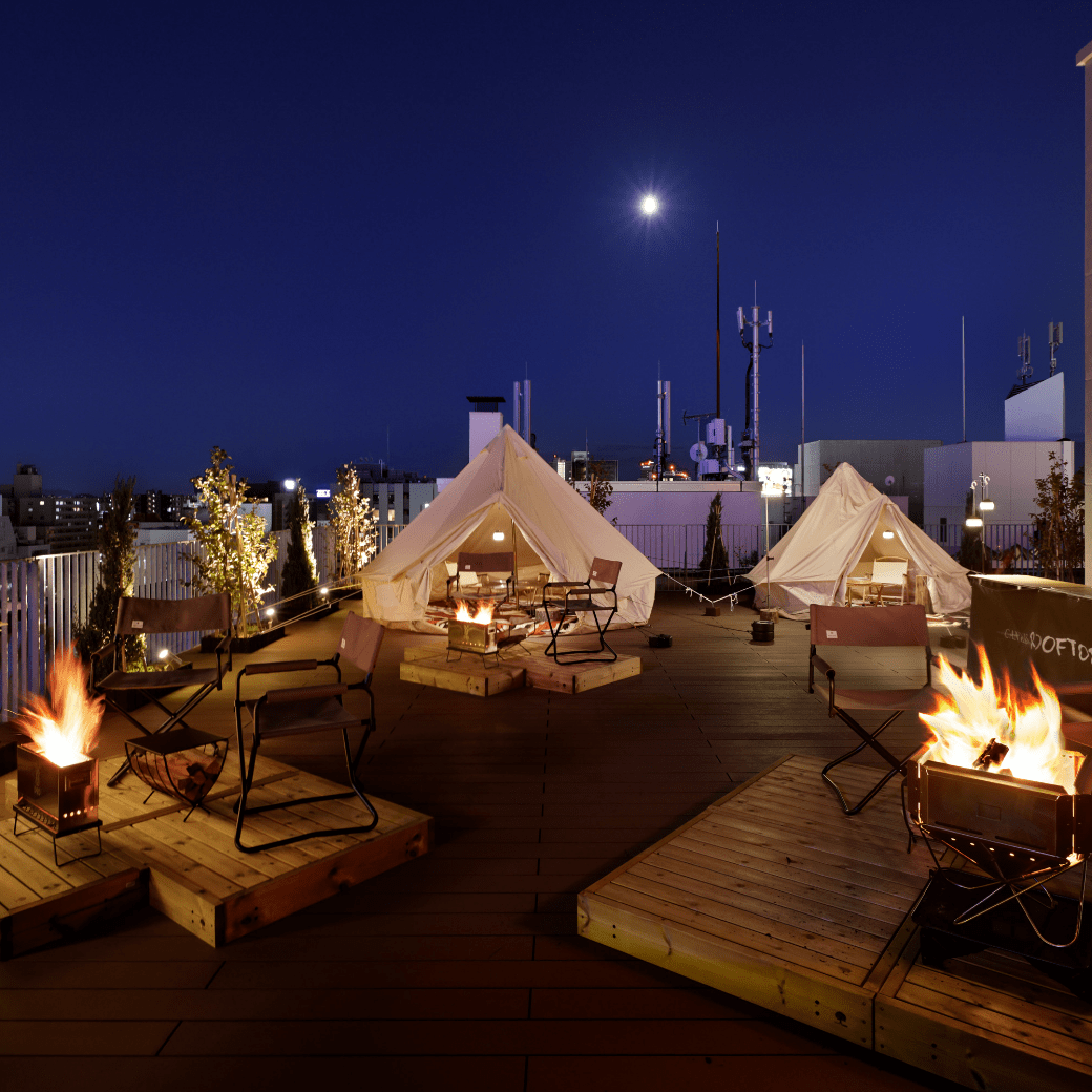 ウッドデッキの床で仕上げられた屋上は、焚き火や屋外シアター、⾳楽イベントなどあなたらしく過ごすCANVAS空間。