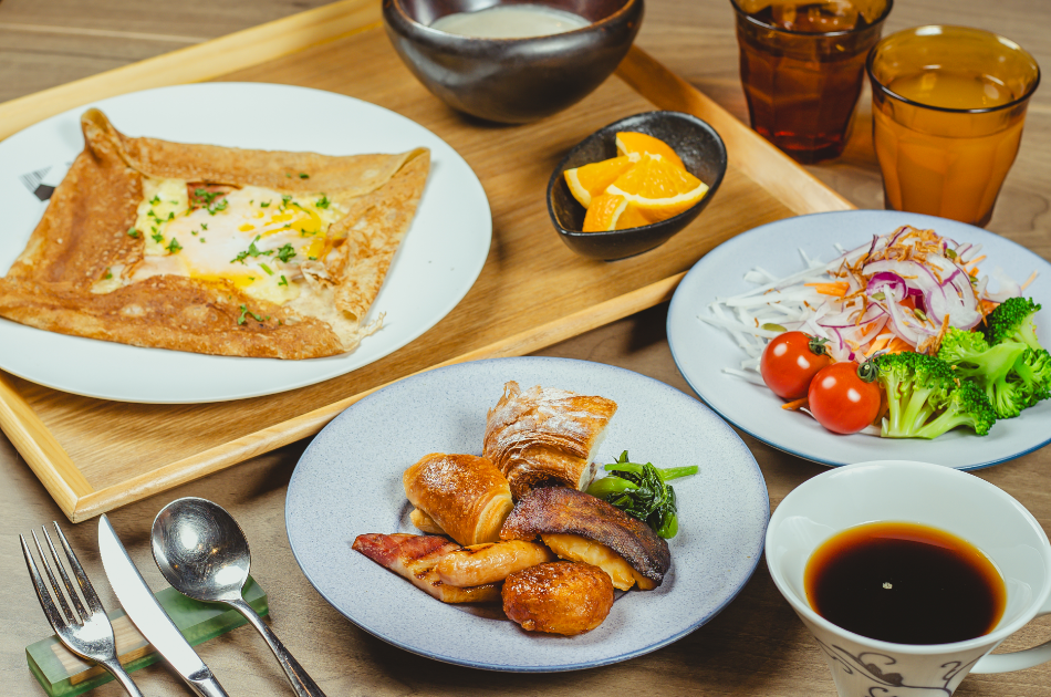 メインプレートのガレットは良質な北海道産の全粒粉を使用し、オープンキッチンで一枚一枚丁寧に焼き上げます。ヘルシーな朝を彩る新鮮なサラダやグリル野菜、そして地元で愛されるベーカリー「どんぐり」のパンも並ぶハーフブッフェを四季折々の表情を見せる大通公園を眺めながらお楽しみください。