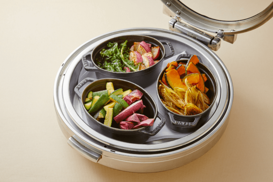 ブッフェでは適切な量をゲストへ提供することが難しく、残った食材が廃棄される場面が発生します。ブッフェ器材に小ぶりの器をいれダブルインナーにすることで、見た目も損なわず大量の廃棄を未然に防ぎ無駄を減らします。