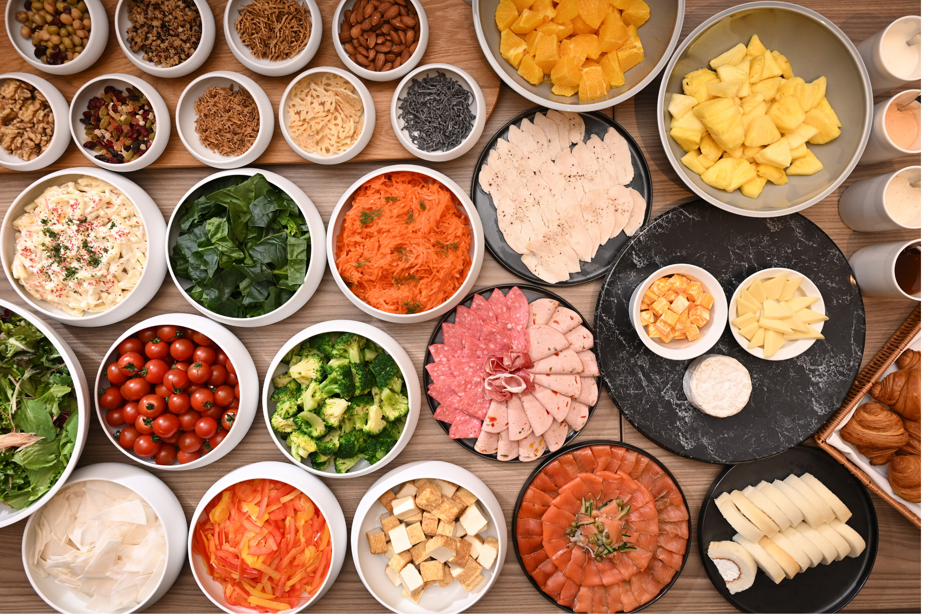 朝食は彩り豊かな野菜やフルーツ、栄養価もプラスできるトッピングなどの素材を揃えた「ウェルネスサラダ」を、