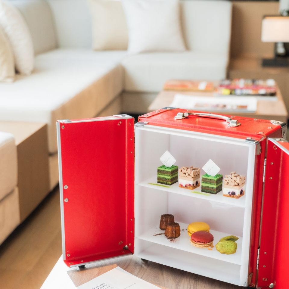 ホテル1Fにある「サダハル・アオキ・パリ 烏丸御池店」のスイーツを、アフタヌーントランクでご用意します。扉を開けて美しいスイーツを「発見」し、京都「小川珈琲」のバードフレンドリー®認証コーヒーや、「Tearoom」の和紅茶と共にお楽しみください。