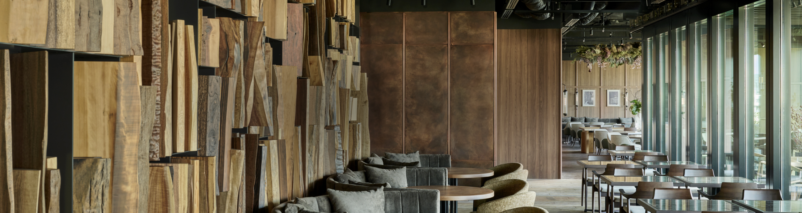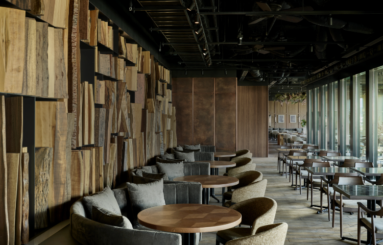 左官職人 挾土秀平氏による左官壁と木曽ヒノキの天井意匠が印象的な「立礼茶室」、そして名古屋の街を一望する眺望抜群のテーブル席からなる、中部ならではのおもてなし空間。