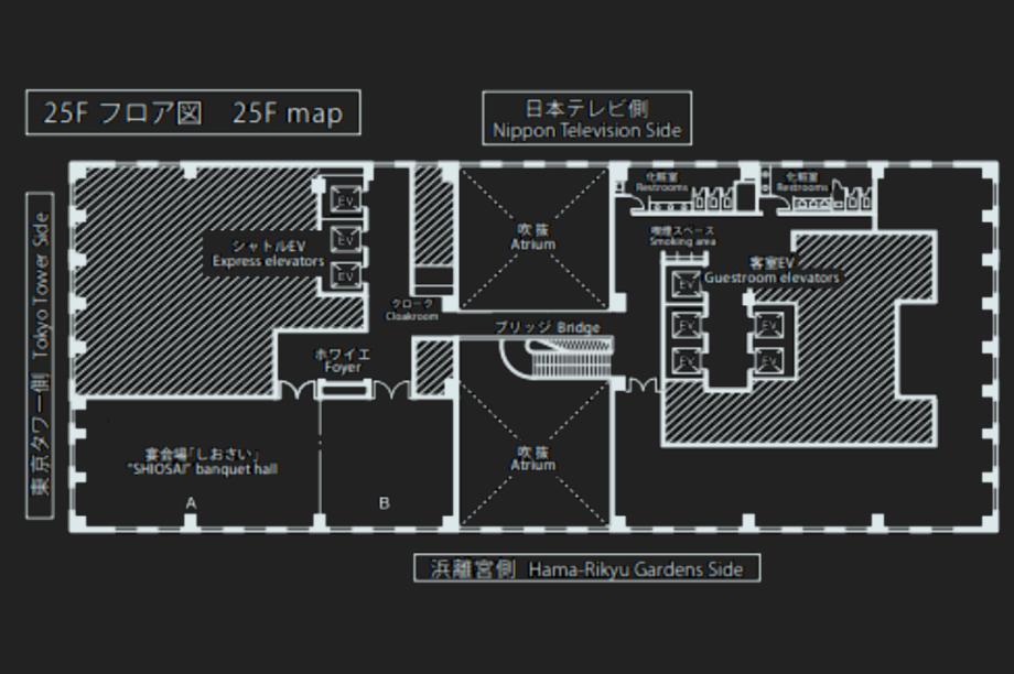 25F宴会場「しおさい」 パーティにもビジネスにも、柔軟に利用できる宴会場。開放感のある大きな窓の外には、浜離宮恩賜庭園の緑やウォーターフロントの風景が広がります。パーティやセミナーなど、用途に合わせたレイアウトに対応します。