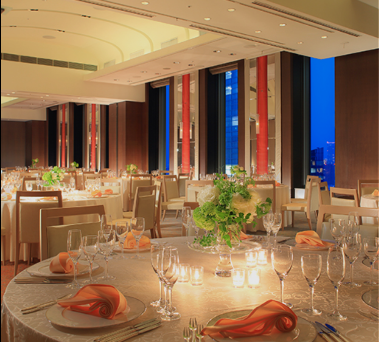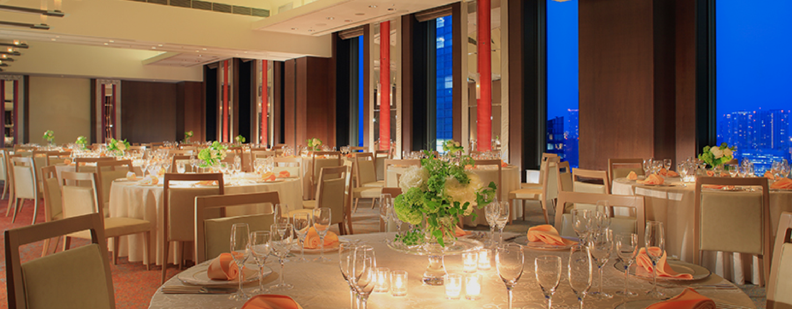 昼は浜離宮恩賜庭園を望む大きな窓から差し込む光、夜は地上約100メートルの高層階からの夜景とともにお楽しみいただける宴会場「しおさい」ご利用のパーティプラン。