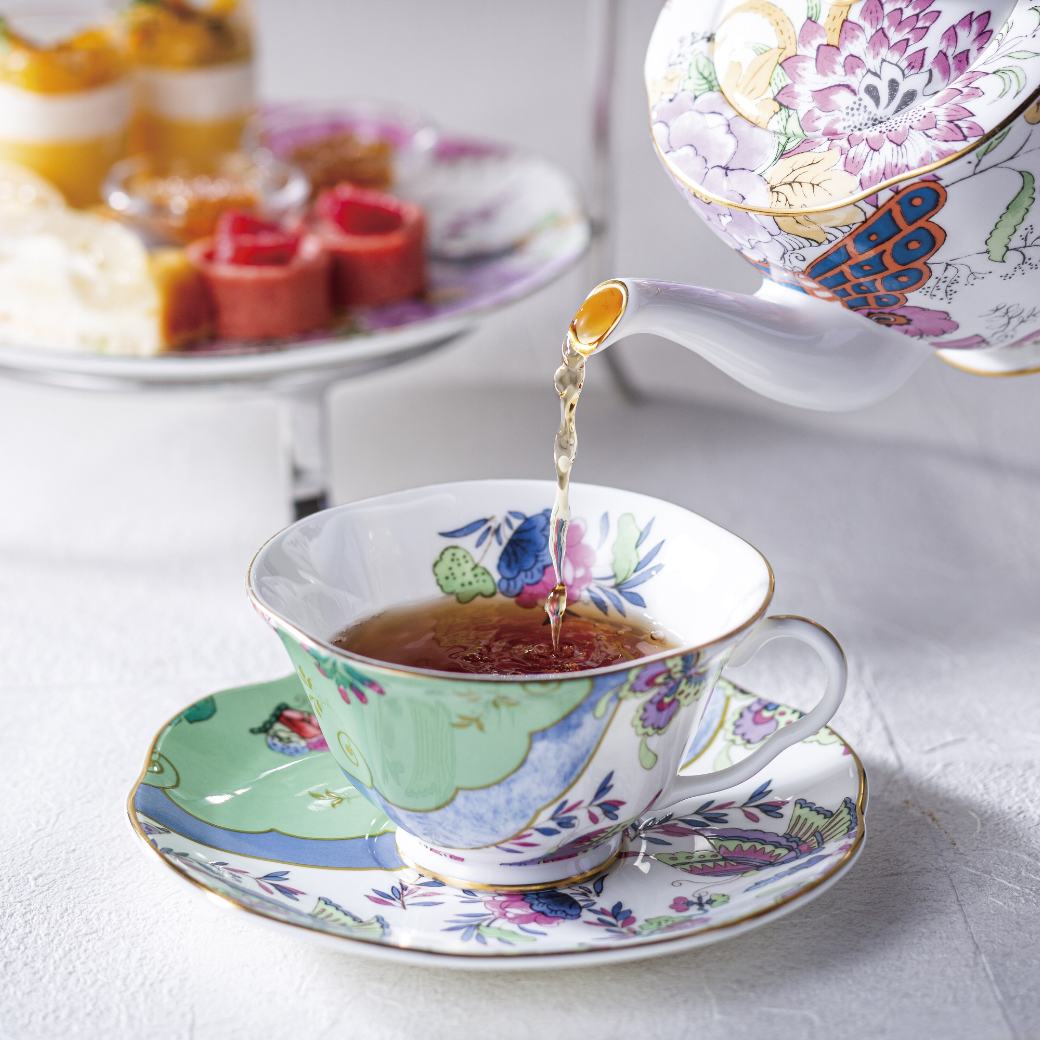 華やかで優美なウエッジウッド社「バタフライブルーム」シリーズのティーセットが優雅な午後のひとときを演出します。