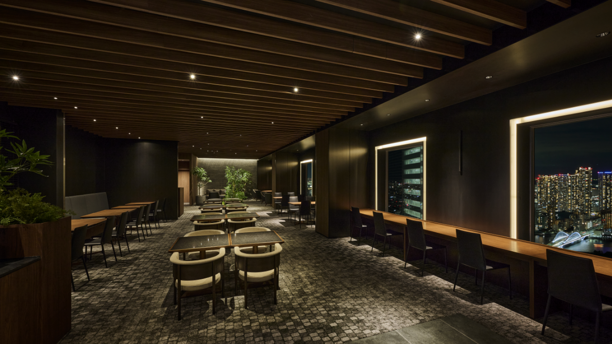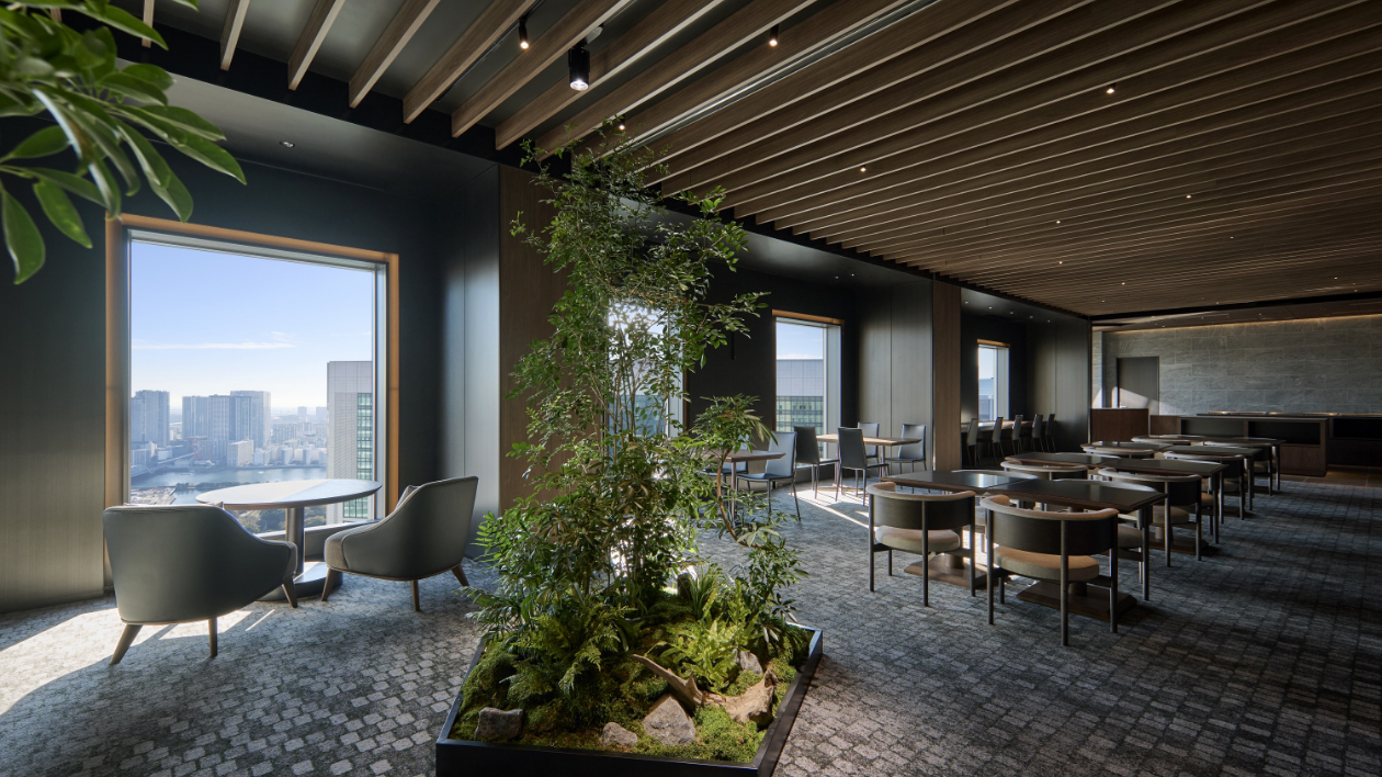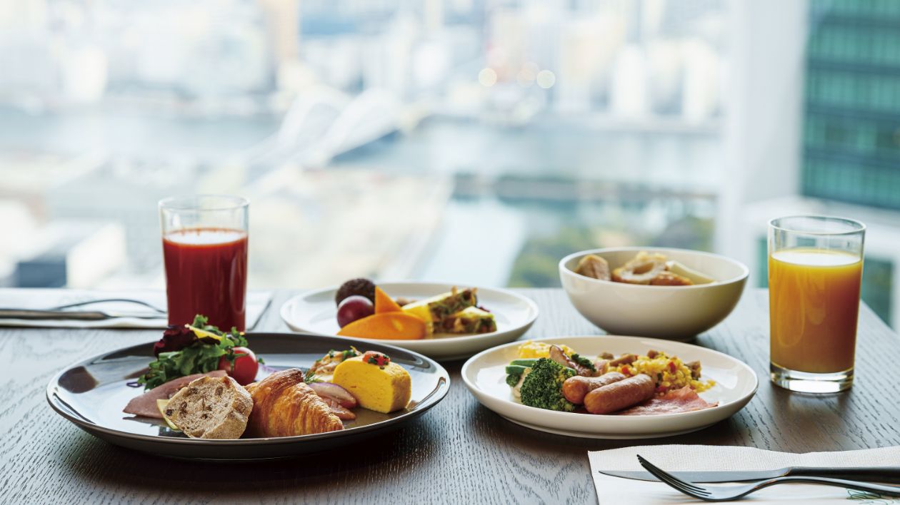 大きくとった窓からは緑豊かな浜離宮恩賜庭園や東京湾ウォーターフロントの摩天楼が一望できます。朝食、リフレッシュメントタイムがお楽しみいただけるうえに、