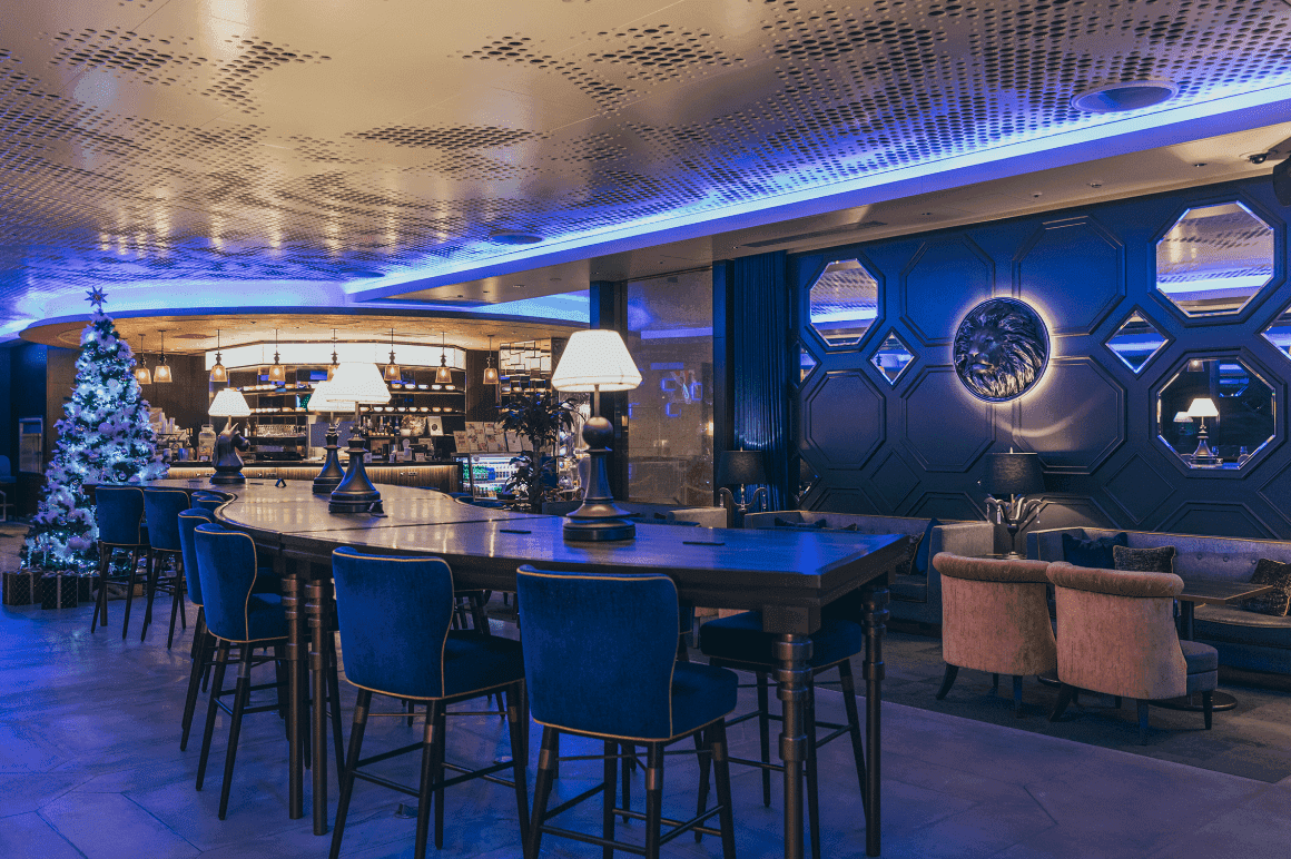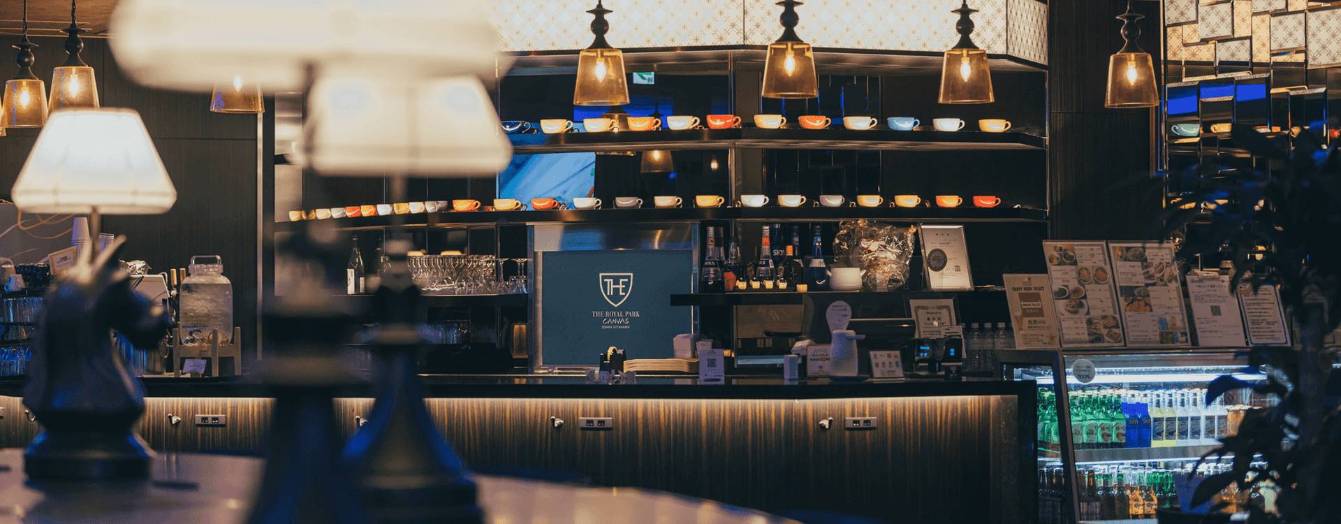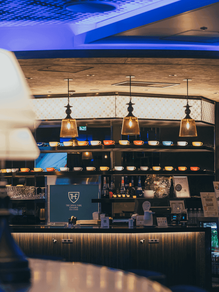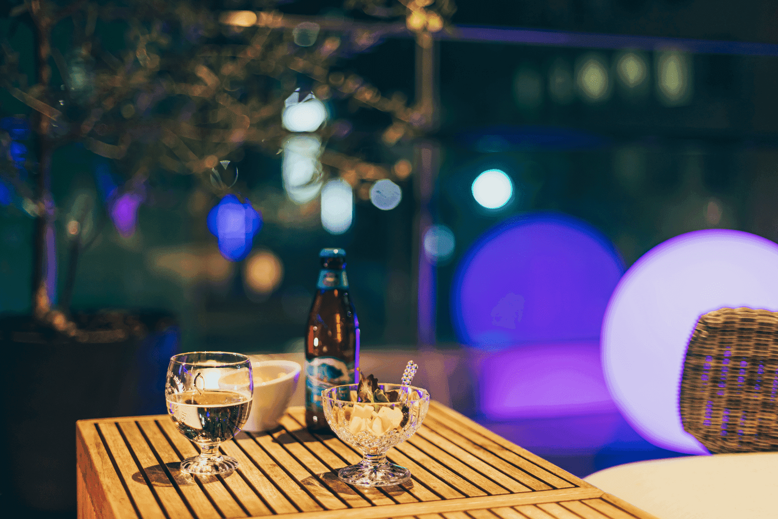 ラウンジにはカフェやアルコールを楽しむ人が集まり、ネオンライトが灯り、一気に大人なムードに包まれる。今日の仕事はもうここまでにして、さあ一杯楽しもう。