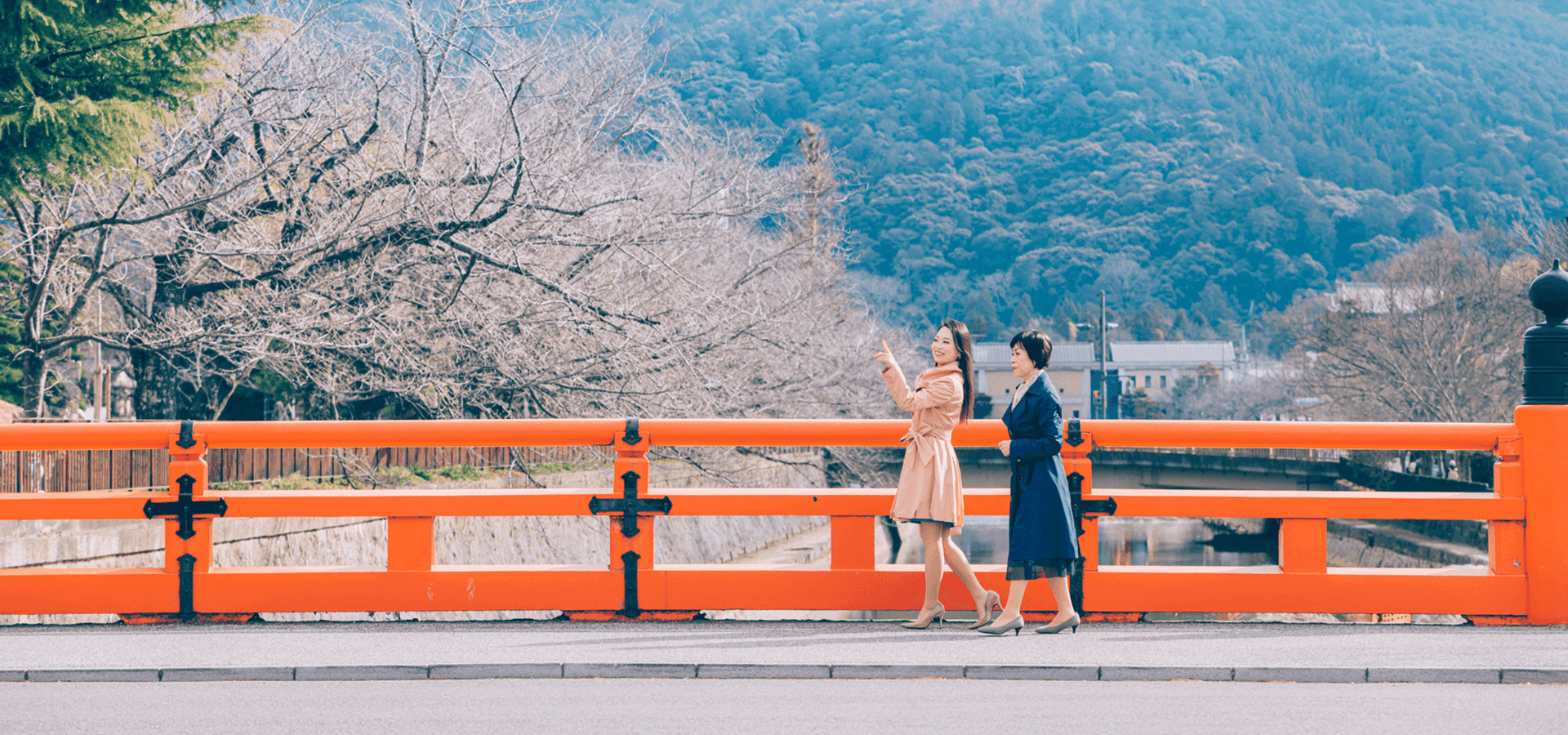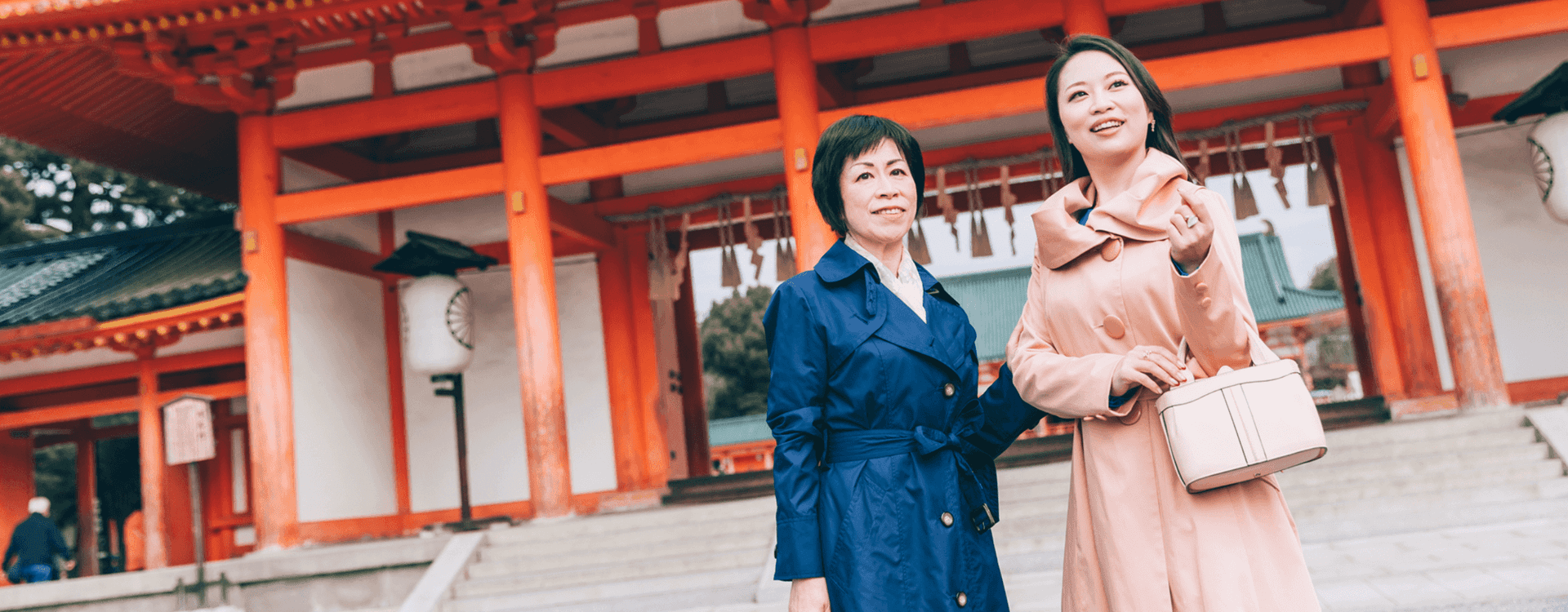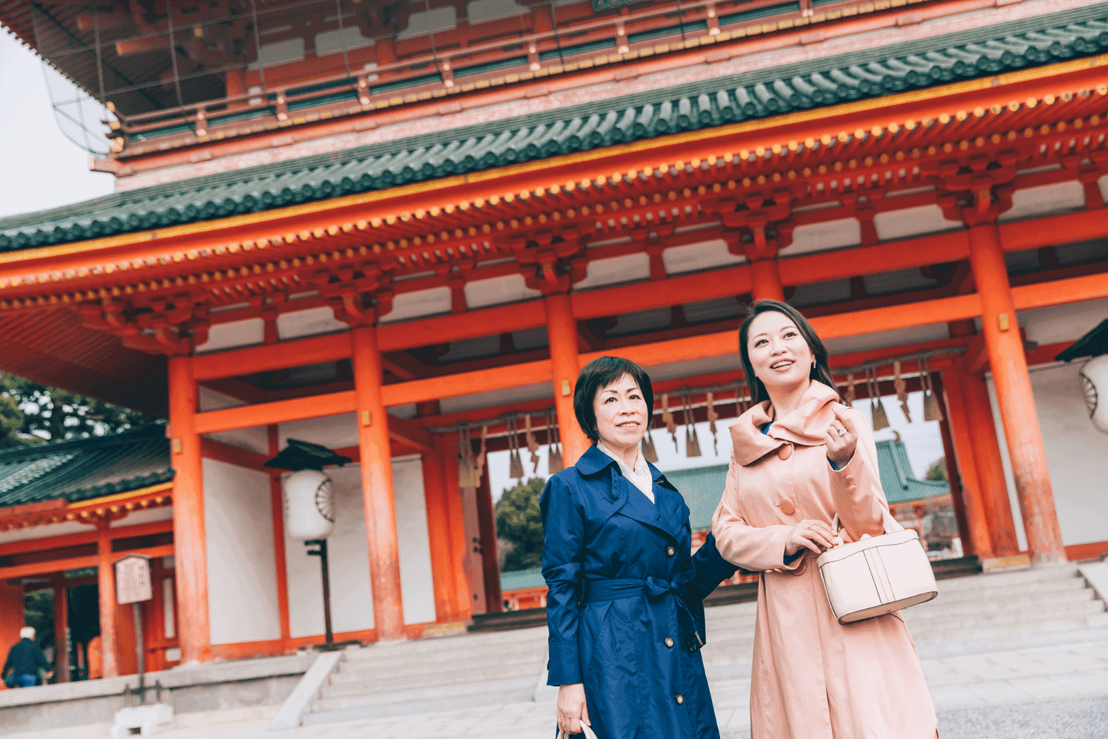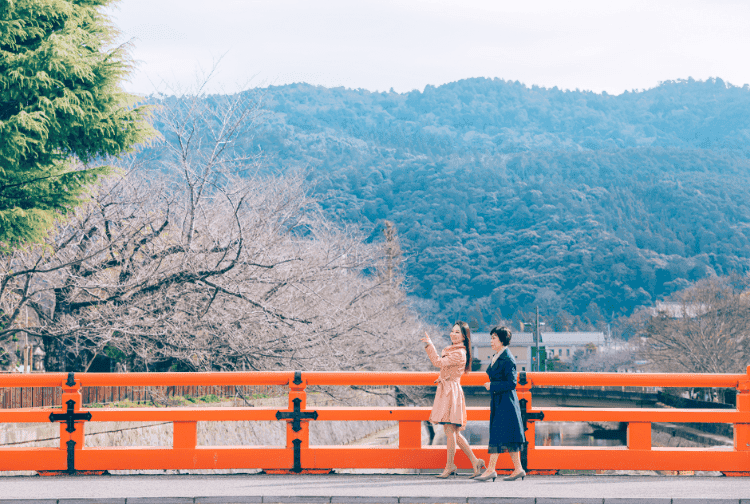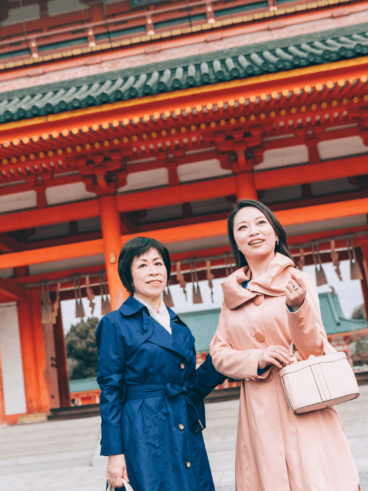 アクティブな旅もいいけれど、せっかく女同士の旅なのだから、ゆったりと美しいものにふれてみたい。とまず目指したのは、京都国立近代美術館。京都市左京区岡崎に位置するこのエリアは、四条から地下鉄と徒歩で20分ほど。京都国立近代美術館をはじめ、京都市京セラ美術館、ロームシアター、平安神宮などさまざまな施設が集まる文化エリアだ。朱色の大鳥居がひときわ目を引く平安神宮でお参りしてから、いざ美術館へと向かう。