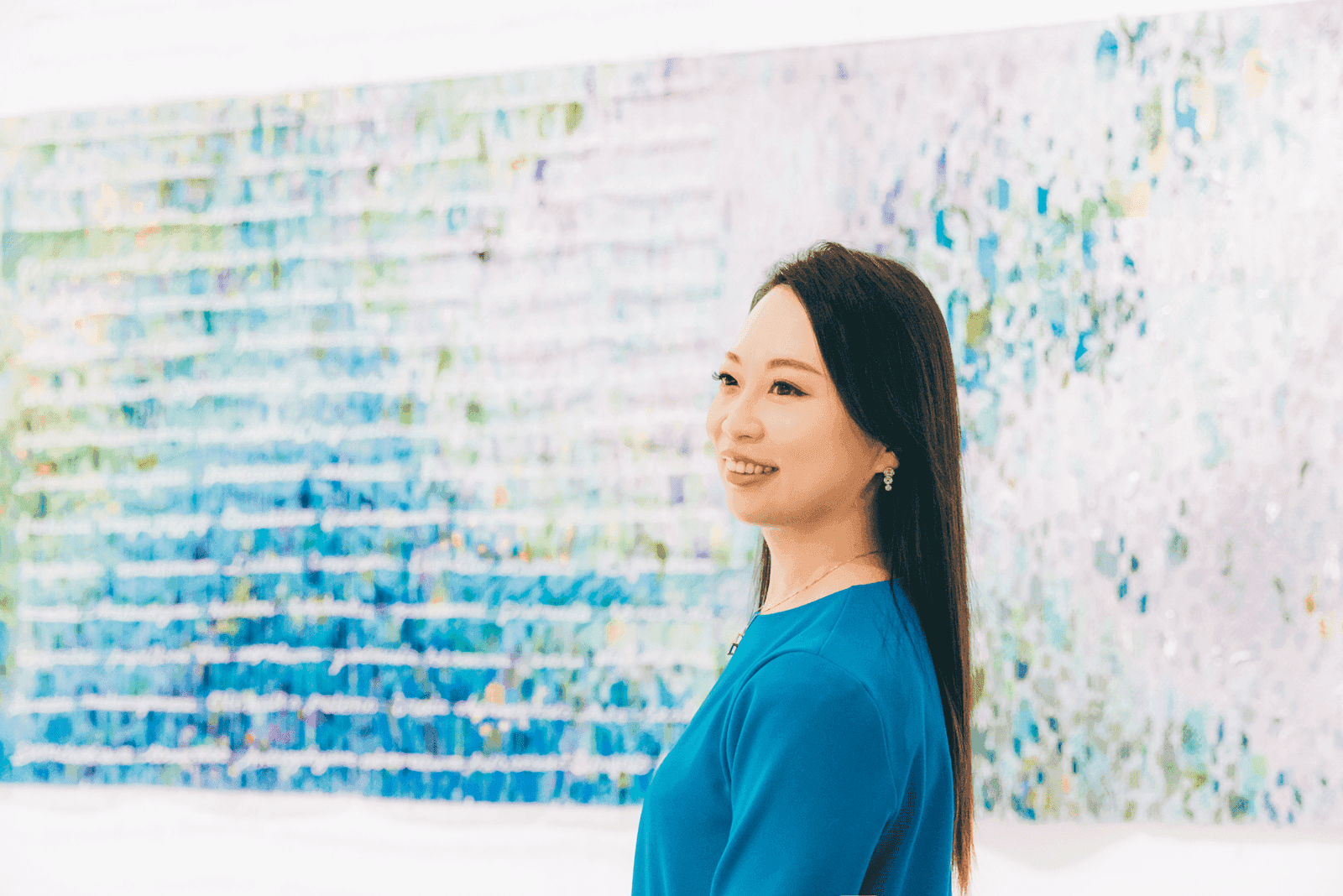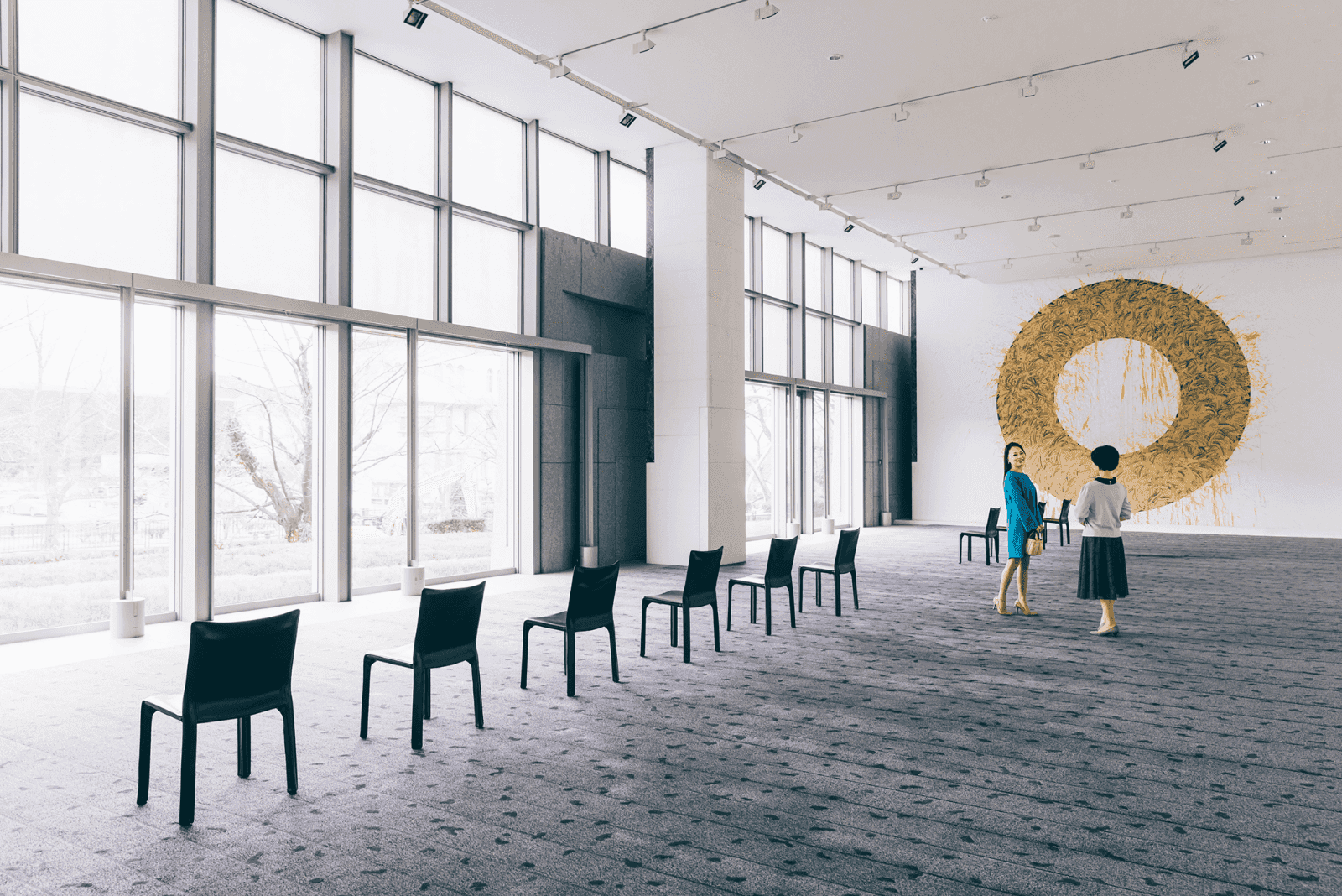 ロビーフロアに飾られた大きなアート作品。桜の開花時期には目の前の琵琶湖疏水沿いにある桜並木が満開になる