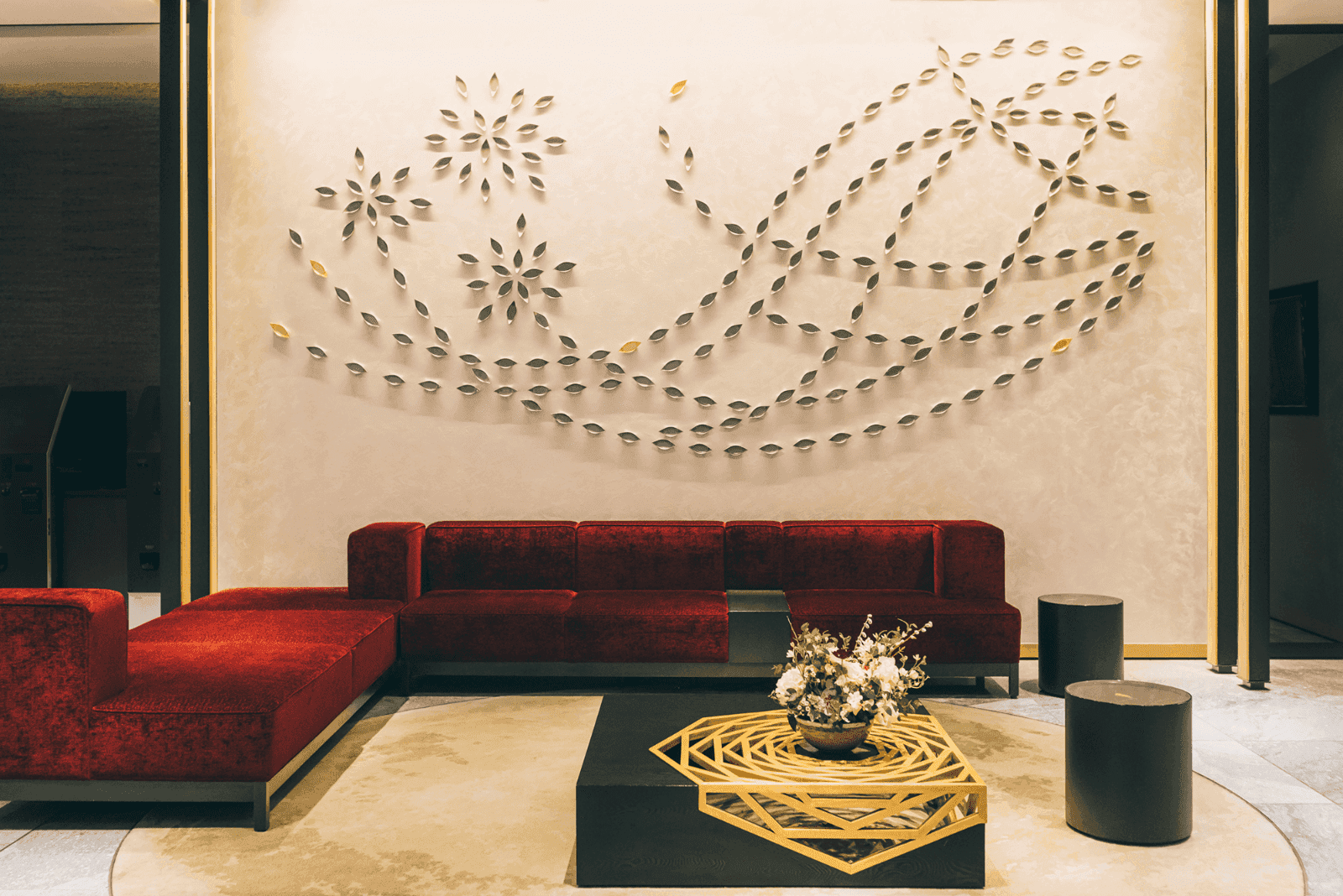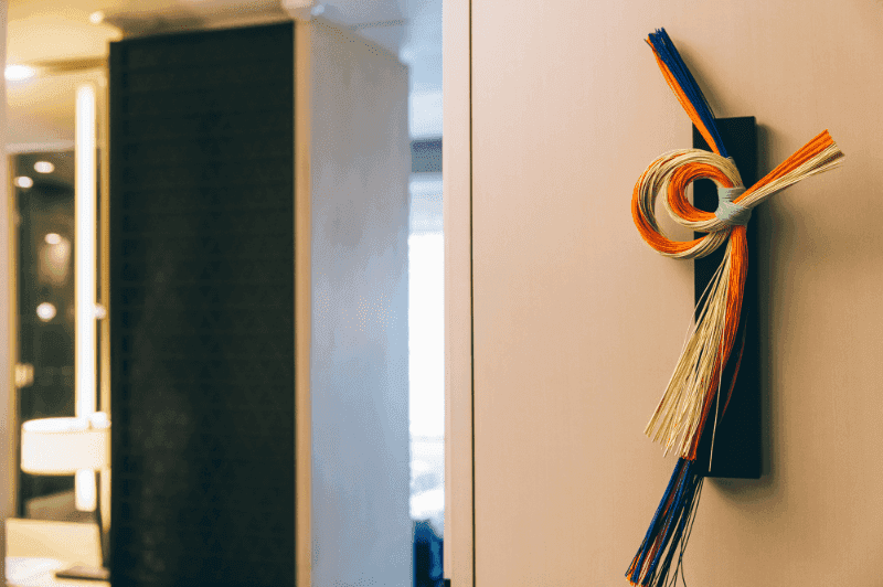 明るく開放的なロビー。壁面のアートは笹舟をモチーフにしたもので、京都らしい情景を織り込んだ繊細さが美しい