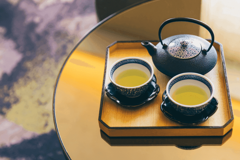 一流ホテルなどでしか味わえないロンネフェルト社の紅茶を片手にホッとひと息。「ホテルの外に出なくても、京都の名店を体験できるなんてお得だね」とこっそり微笑み合う。