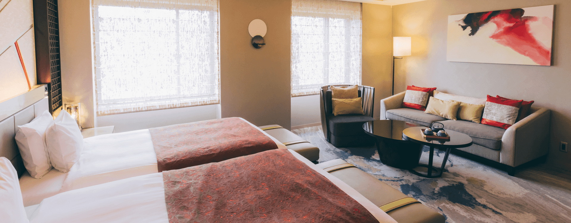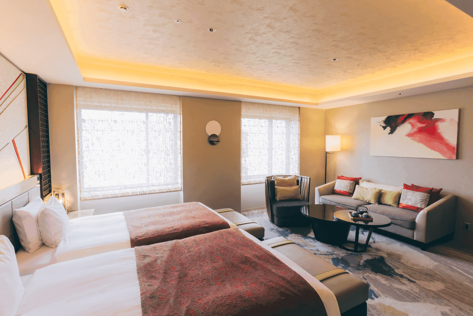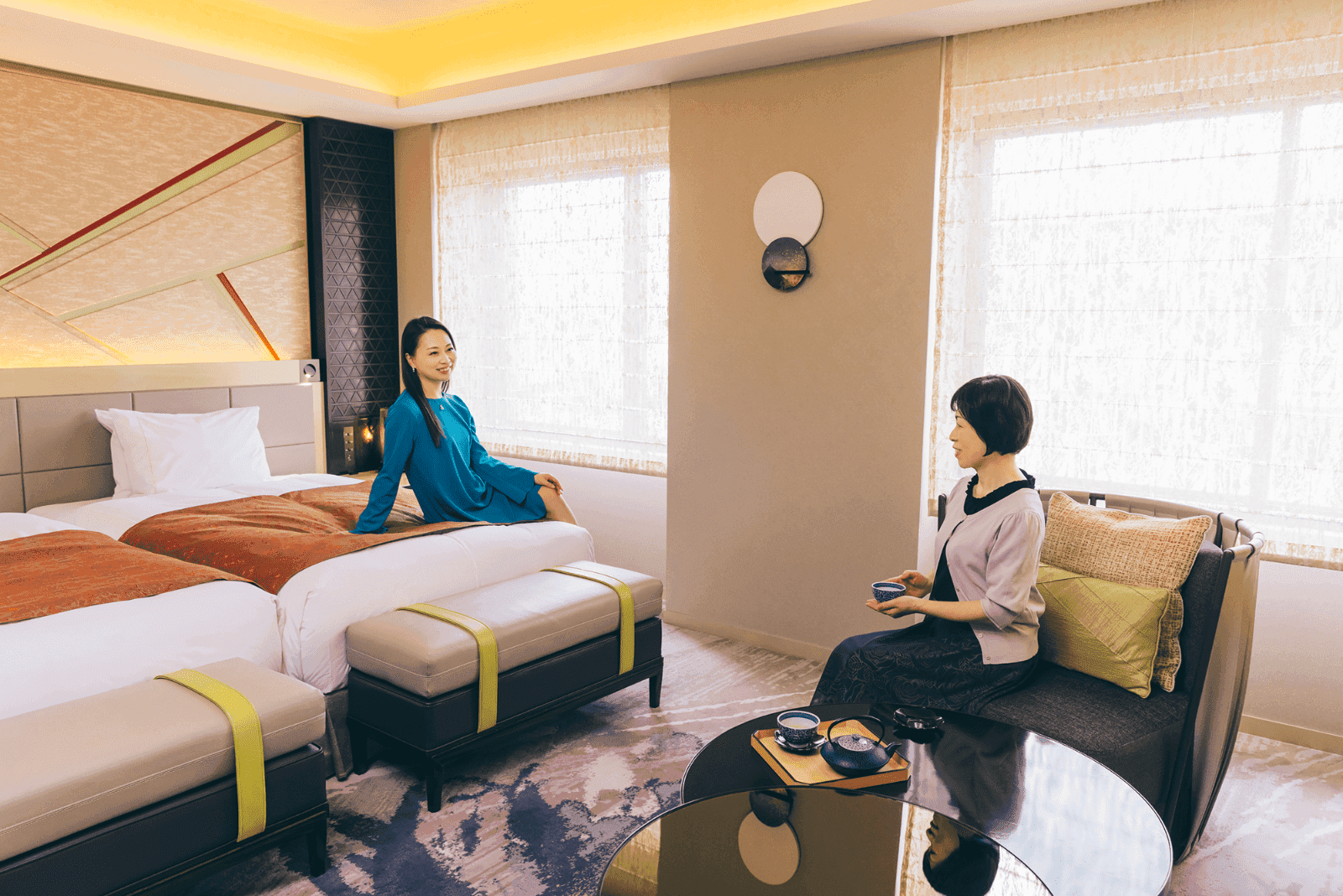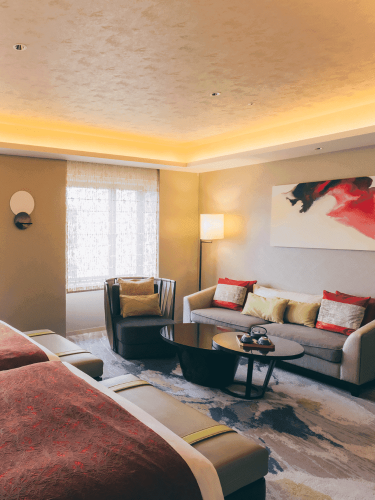 大きな窓がある客室内は随所に京の美を感じる。落ち着きの中にも、色鮮やかで遊び心ある華やかな空間