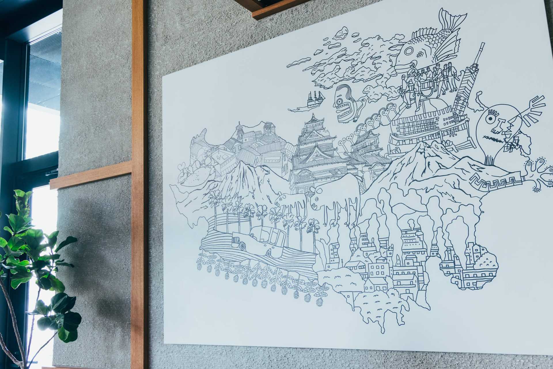 - 九州各地のイラストをコラージュした九州マップ。CANVASラウンジを象徴するモチーフに。