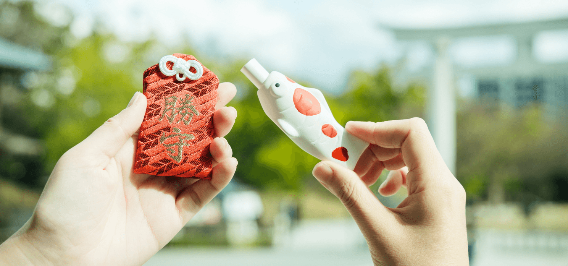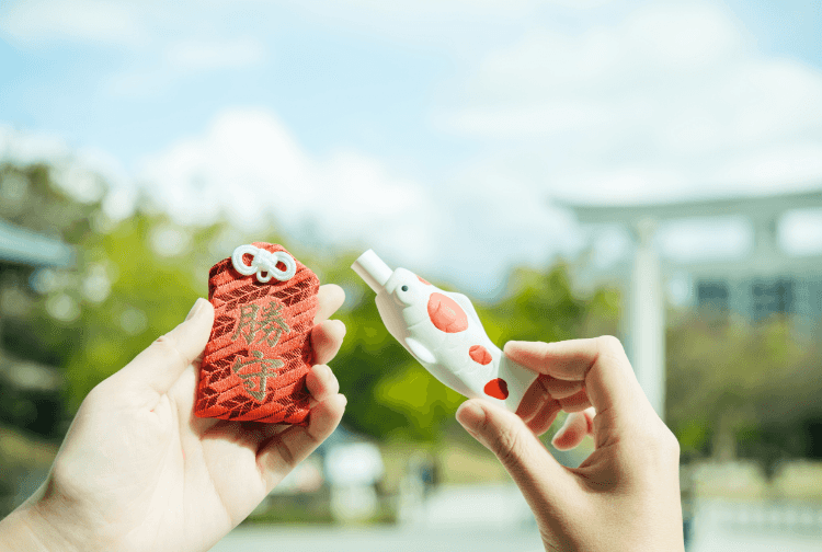 参拝後には、選手たちにも毎年渡されるという勝守と鯉を模した可愛らしいおみくじを手に。