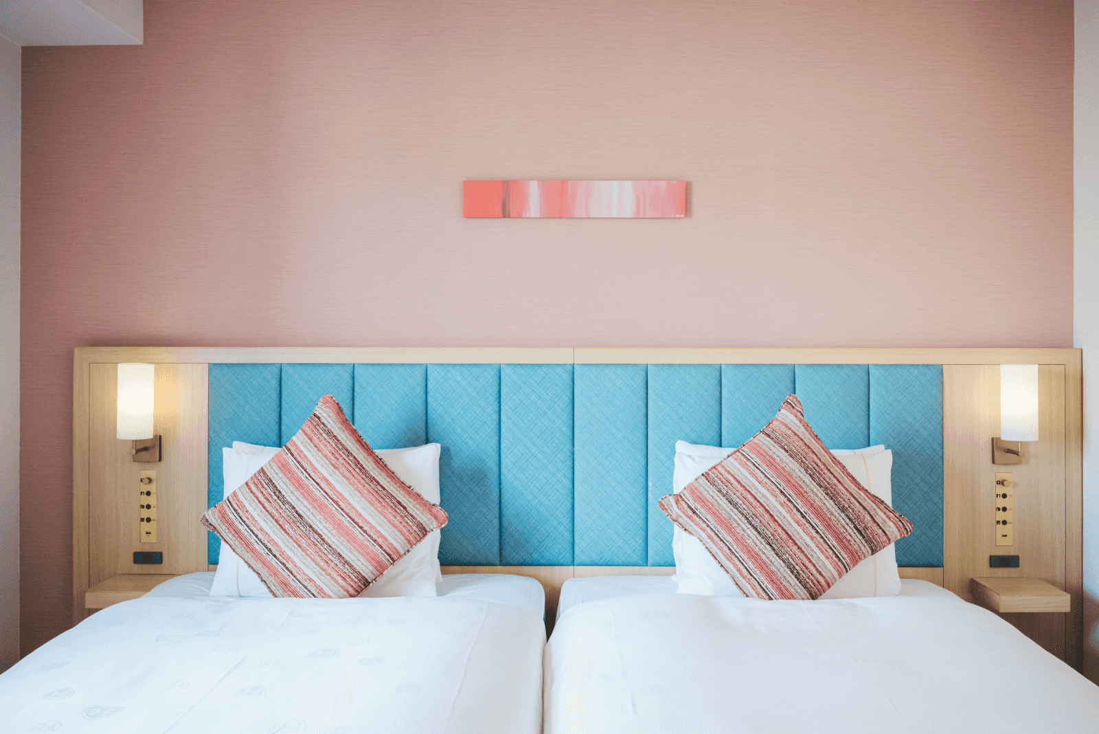 ピンク以外にパステルブルーの客室も。部屋タイプにより内装は異なるから、泊まる人数やシチュエーションによって変化を楽しめる