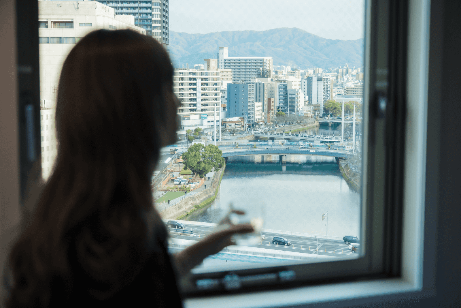 思わず声を上げたくなるのは、客室に入った瞬間に目に飛び込んでくるパステルカラー。淡く可愛らしいピンク色の壁やウッド調の家具、アートにいたるまで優しく愛らしい雰囲気の中に、洗練された大人っぽさも感じる。窓からは目の前の京橋川と市内の街並みをのぞむ景色で、コンパクトながら快適に過ごせそう。
