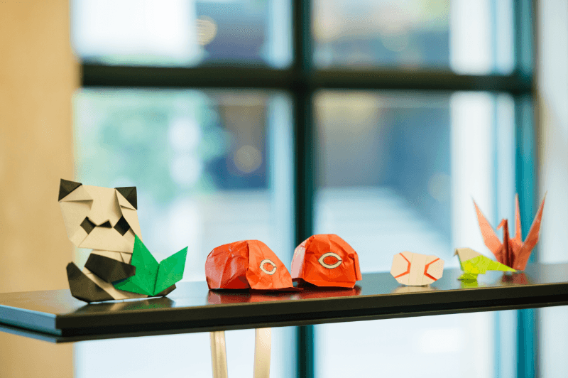ホテルの中に入ると、広々としたロビースペースが。ふとその一角に目をやると、折り紙で作られた鶴に、鳥に、パンダ、それから…。