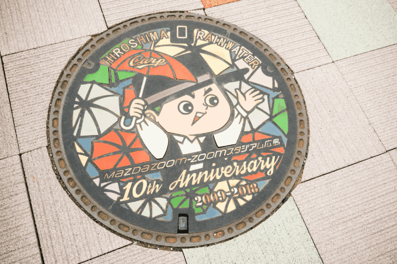 左)球団創立70周年を記念したモニュメント。右)球場周辺にはカープのマスコットキャラクター「カープ坊や」のマンホールが