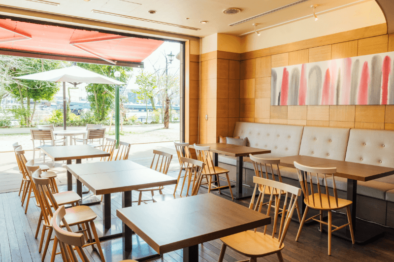 開放感あふれる大きな窓からは、テラス席越しにリバービューが。遊歩道を散歩する人やランニングする人を横目に優雅な朝食時間にひたろう。
