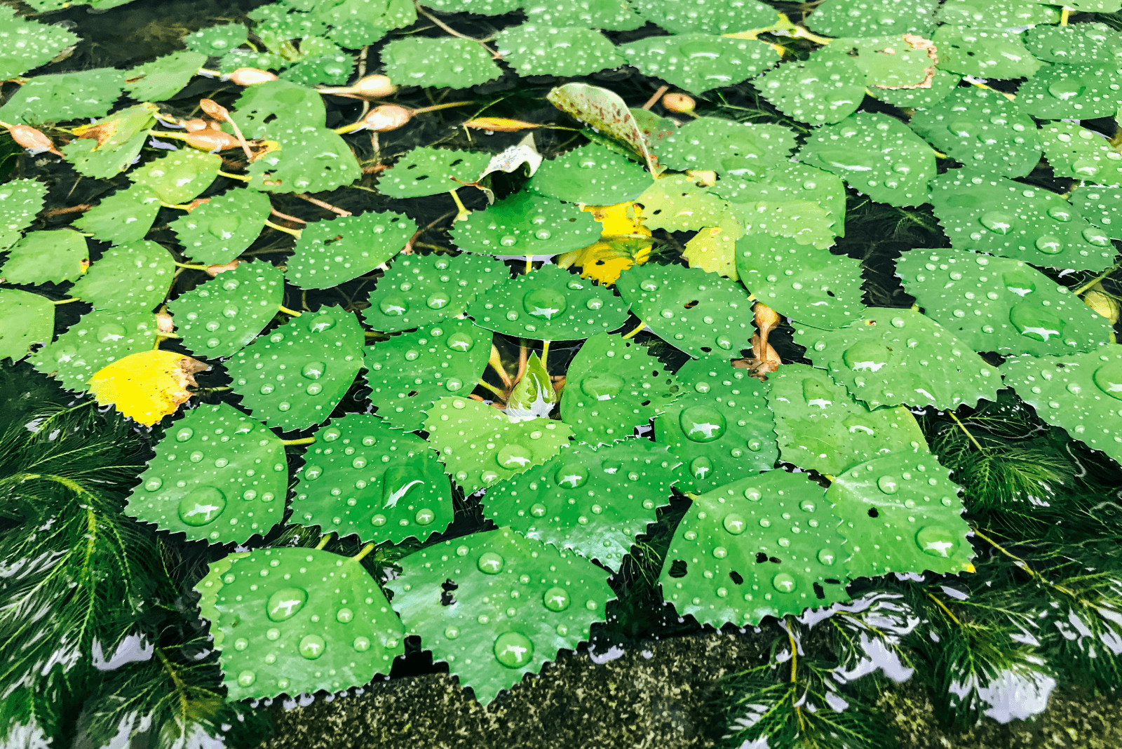 ヒシは決して悪者ではなく、水辺に暮らす小さな生物の隠れ家、という大切な役割を持っている。