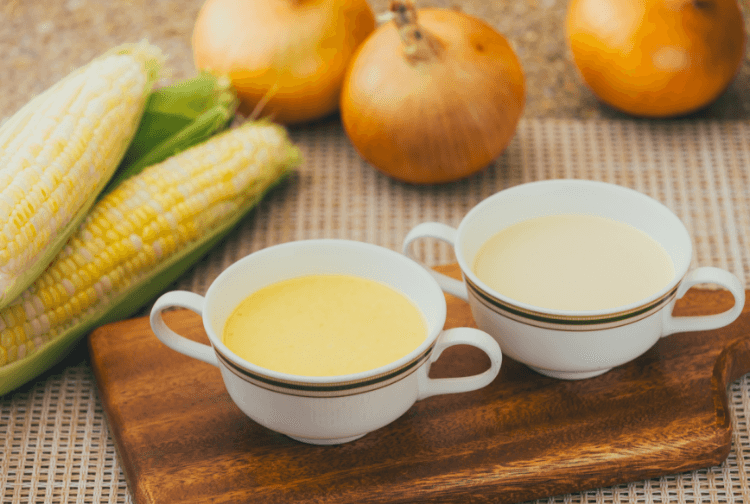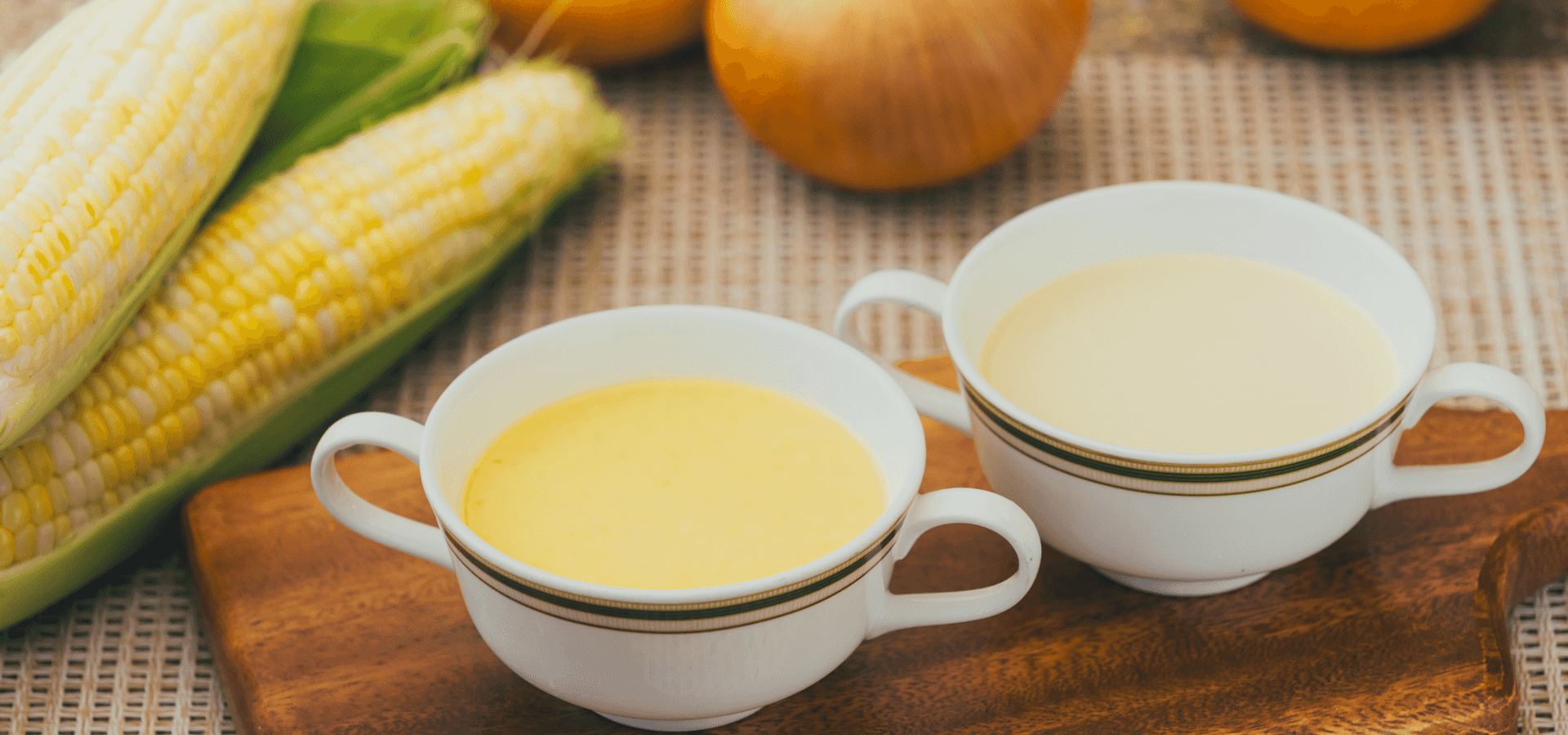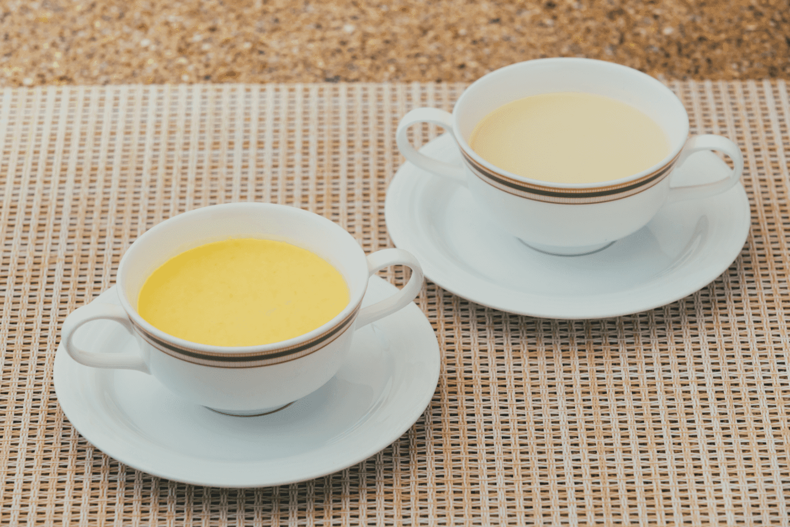 ロイヤルパークホテルズで2024年9月1日~10月31日の期間限定で提供されているオニオンとトウモロコシ、ふたつのスープ。