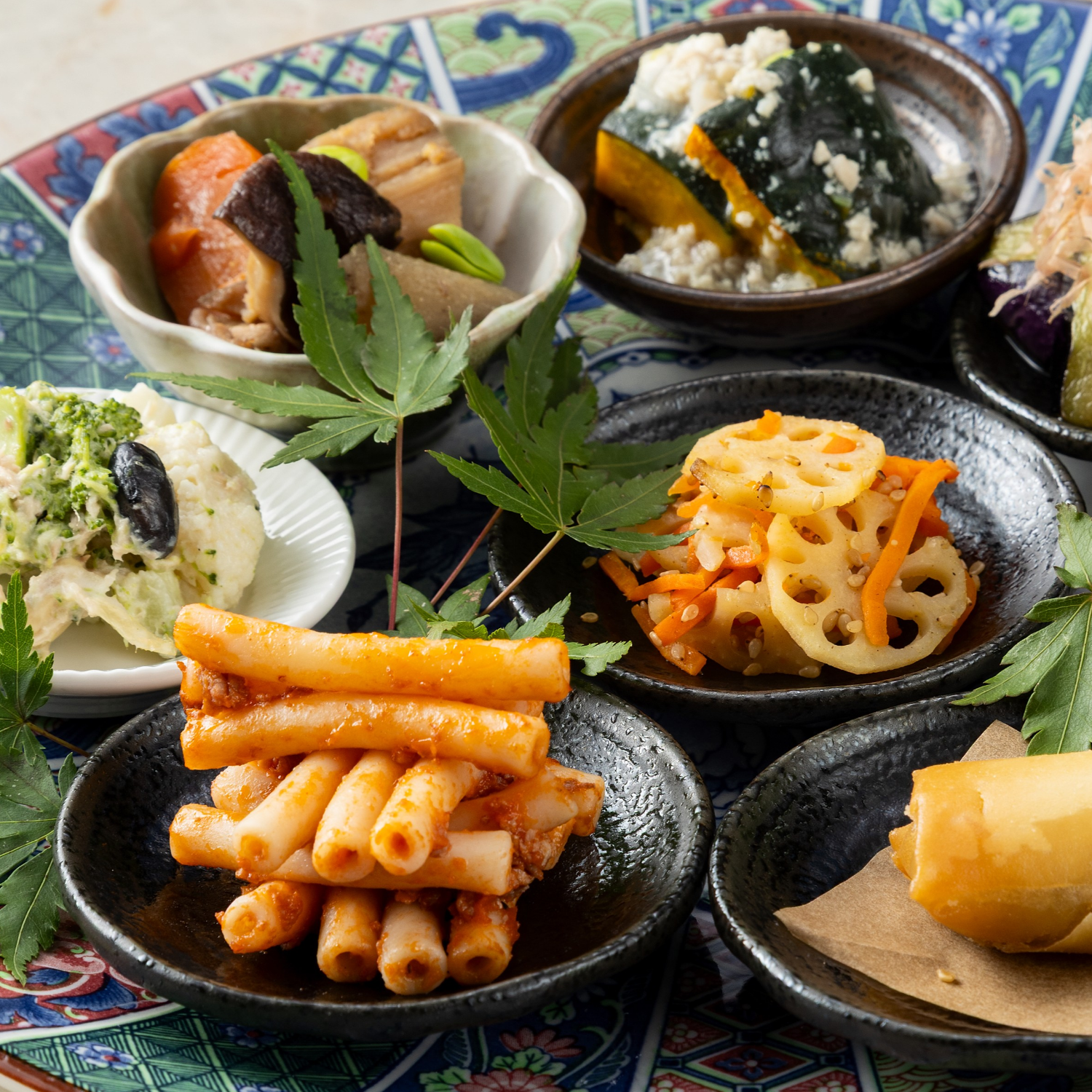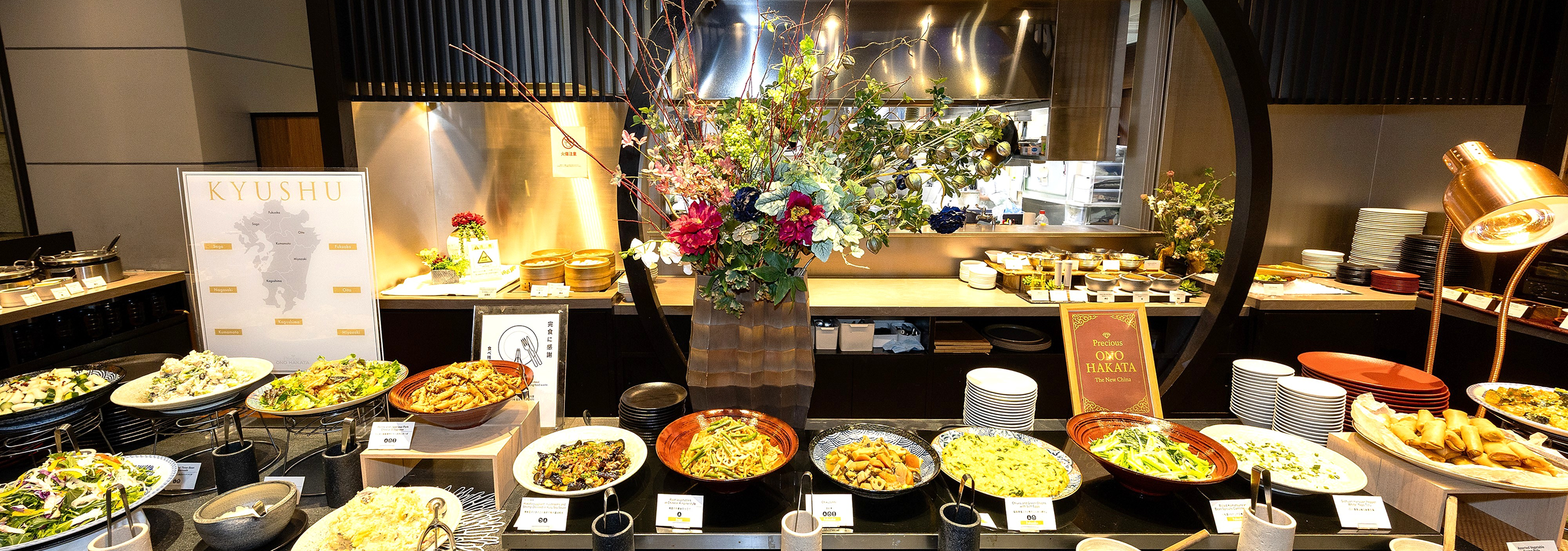 「福岡県名物筑前煮」などの福岡名物に、「山椒香る胡瓜と大根の四川風涼菜」や「四川漢源山椒白麻婆豆腐」などの中華料理。福岡の中華ダイニングならではのお料理をブッフェ台より自由にお取りください。