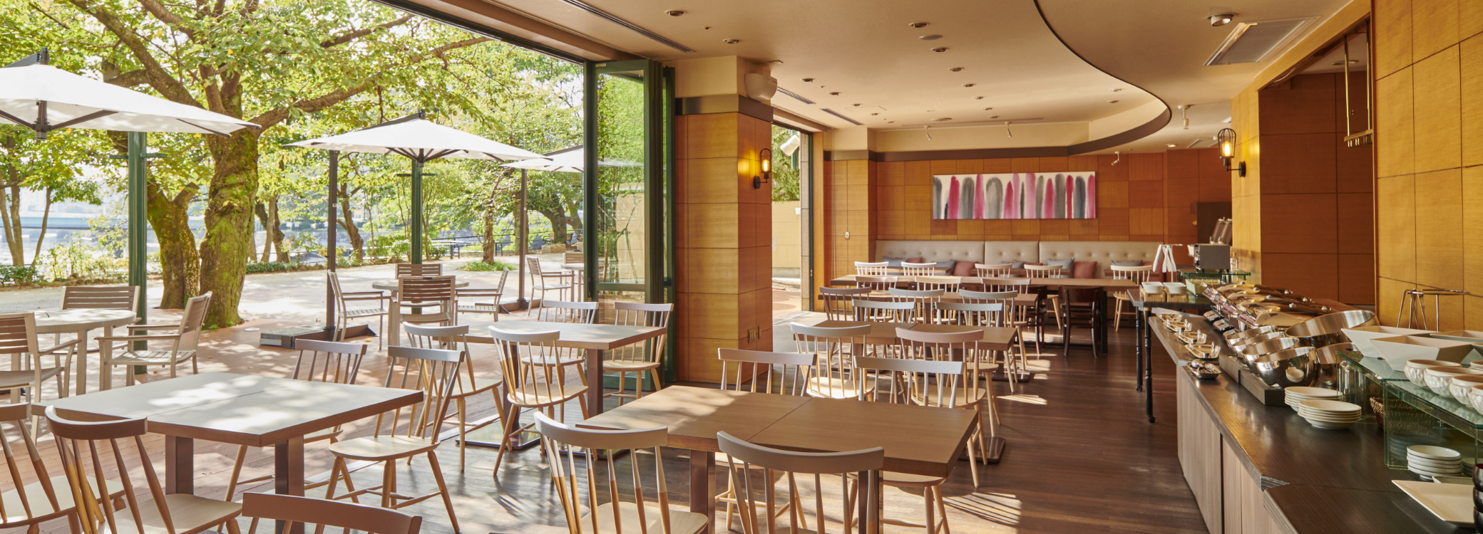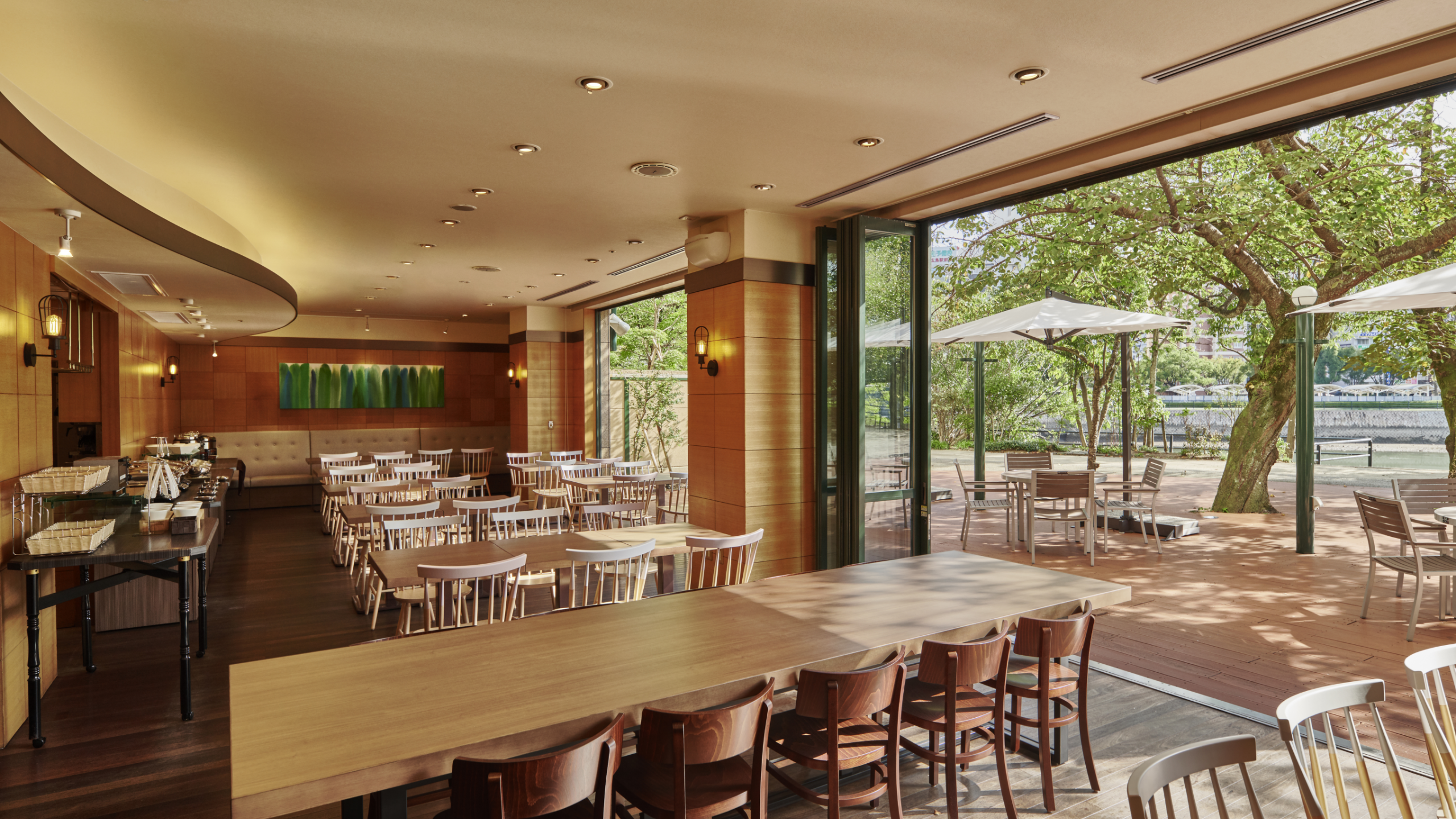 川沿いに佇むナチュラルな雰囲気のカフェ。テラスを抜ける風を感じながら、ご朝食、ランチ、ティータイムをお楽しみください。