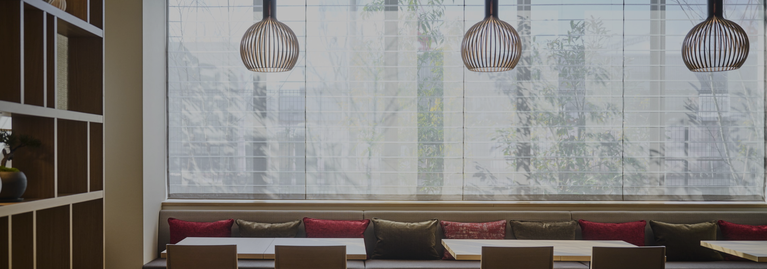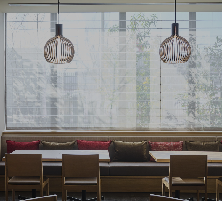 自然光が気持ち良い、ホテル1Fに位置するレストラン「梅ごろも」。旅の活力となる和洋の朝食とランチをご用意しております。店内には、「茶わん」をイメージした立体オブジェや京都の老舗「開化堂」の茶筒をディスプレイ。「和」の味わいを感じられる空間で、お料理をお楽しみください。