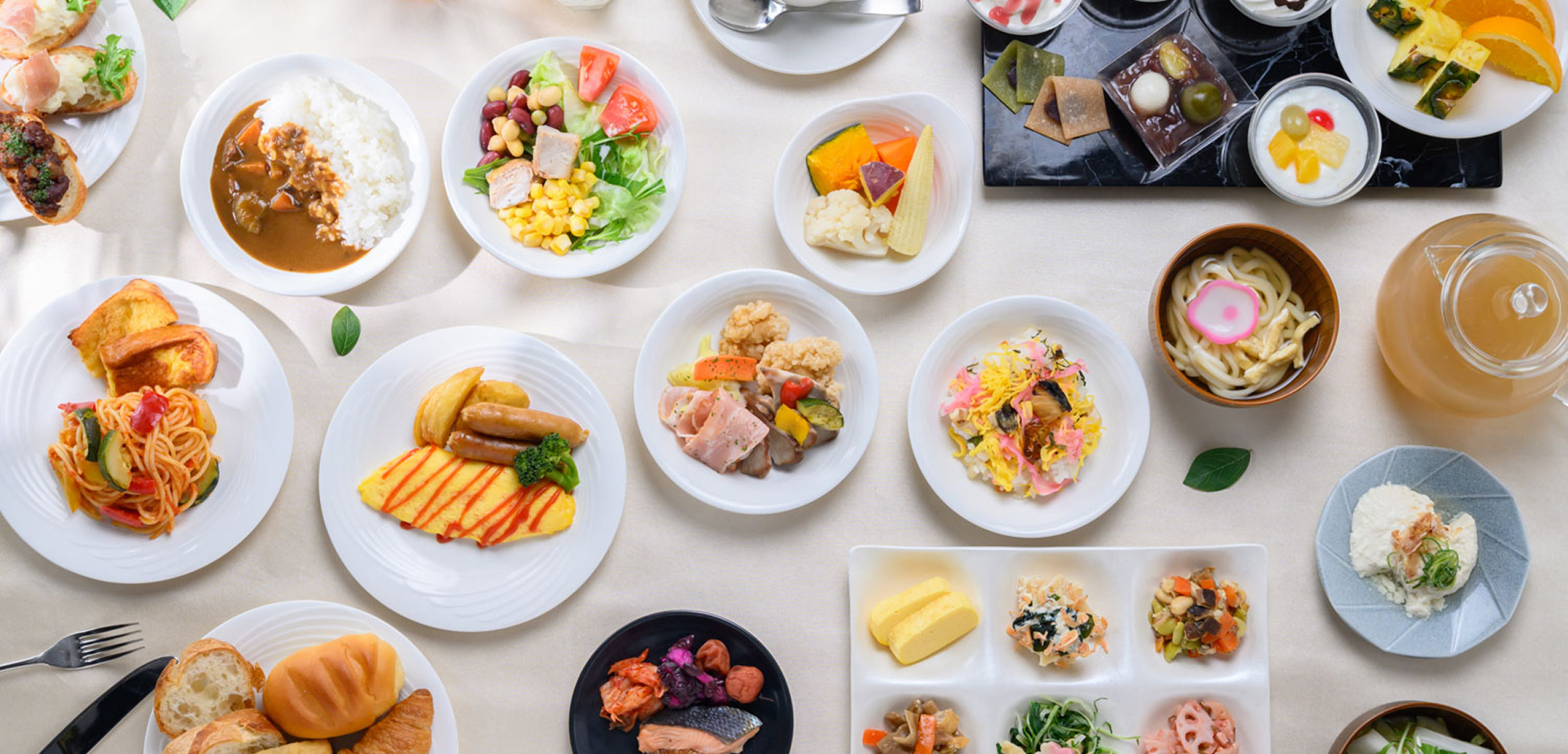 - 梅ごろもプレスサンド/オムレツ/サラダ/梅ごろもビーフカレー/焼魚/白身魚となすのネギ塩ソースかけ/グリル野菜とトマトパスタ/白米/味噌汁/もち豚と湯葉の豆乳仕立て/おぼろ豆腐/出汁巻きたまご/京生麩と水菜の炊いたん/筍とわかめの白和え/漬け物/パン/ヨーグルト/フルーツ/生八つ橋/白玉ぜんざい/ドリンク各種