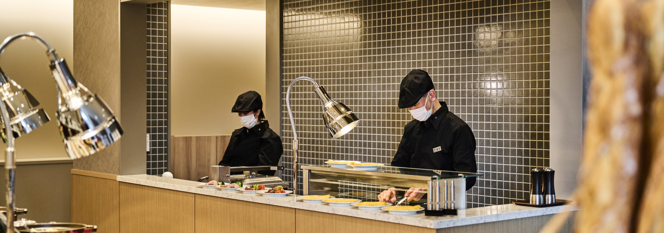 ライブキッチンでは、しば漬けやローストポーク、ロースハム、チェダーチーズを挟んで焼き上げた梅ごろもプレスサンドやオムレツをご用意します。出来立ての美味しさと心のこもったひと皿をお楽しみください。