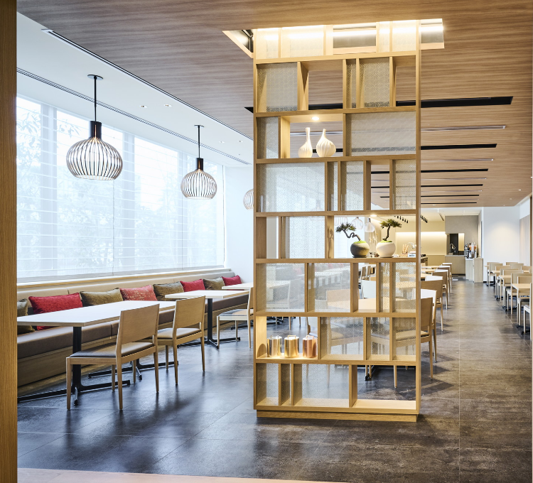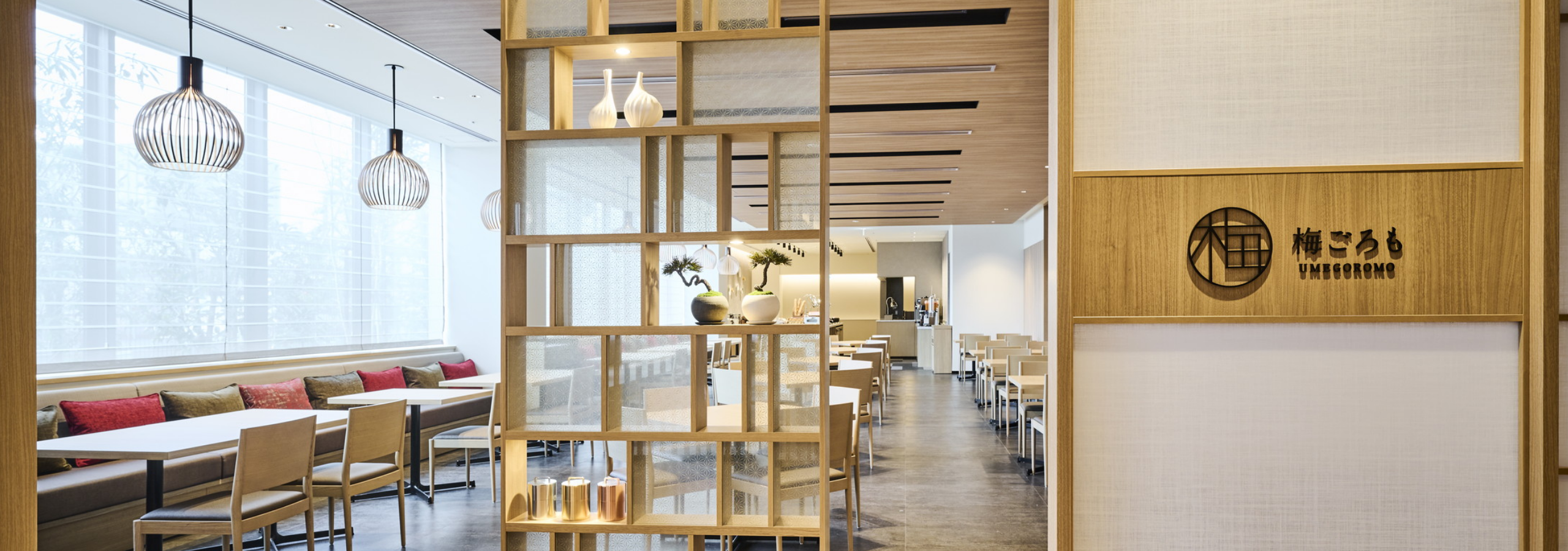 自然光が心地よいレストラン「梅ごろも」。店内には、茶わんをイメージした立体オブジェや京都の老舗「開化堂」の茶筒をディスプレイ。