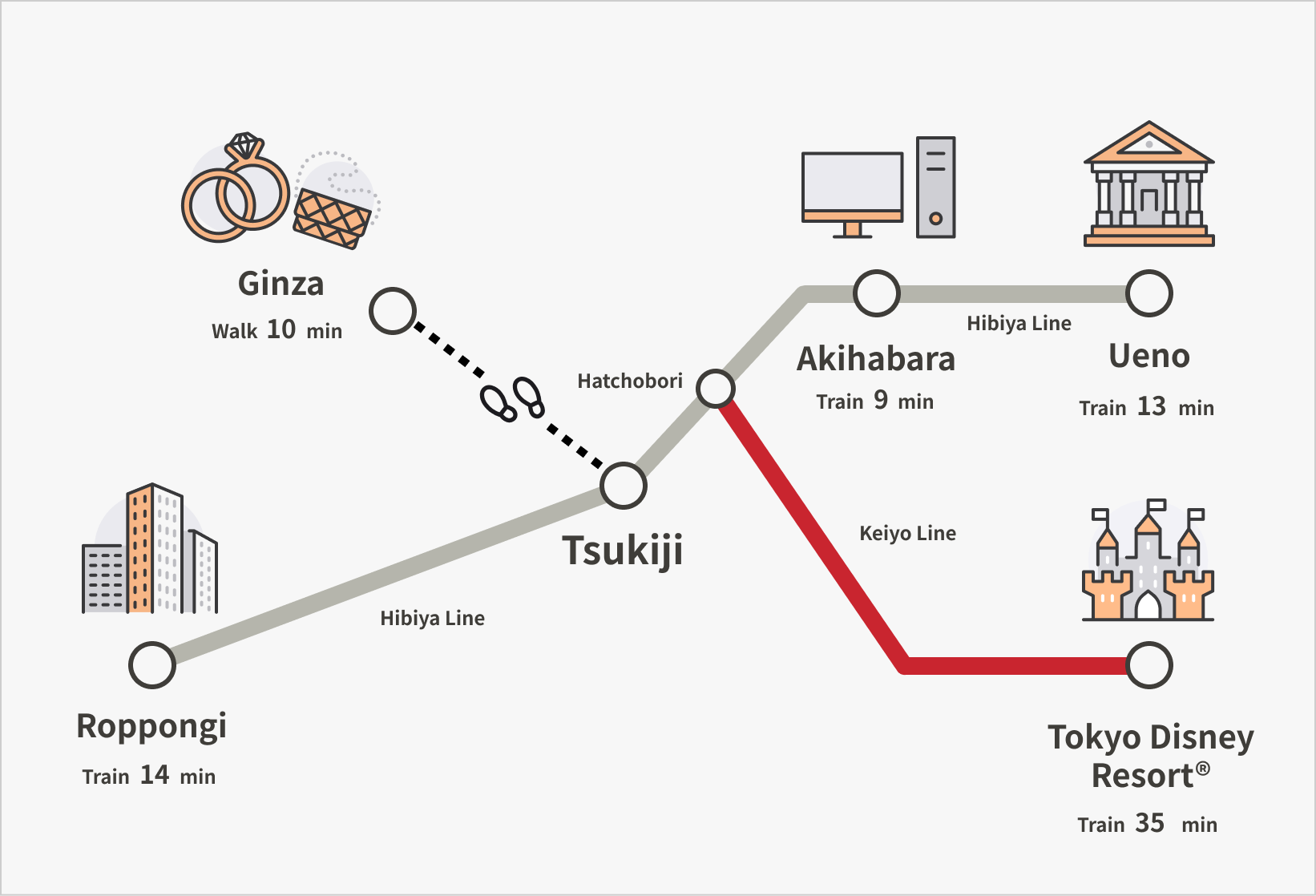 銀座へ徒歩約10分。上野・秋葉原へ乗り換えなしの一本で。